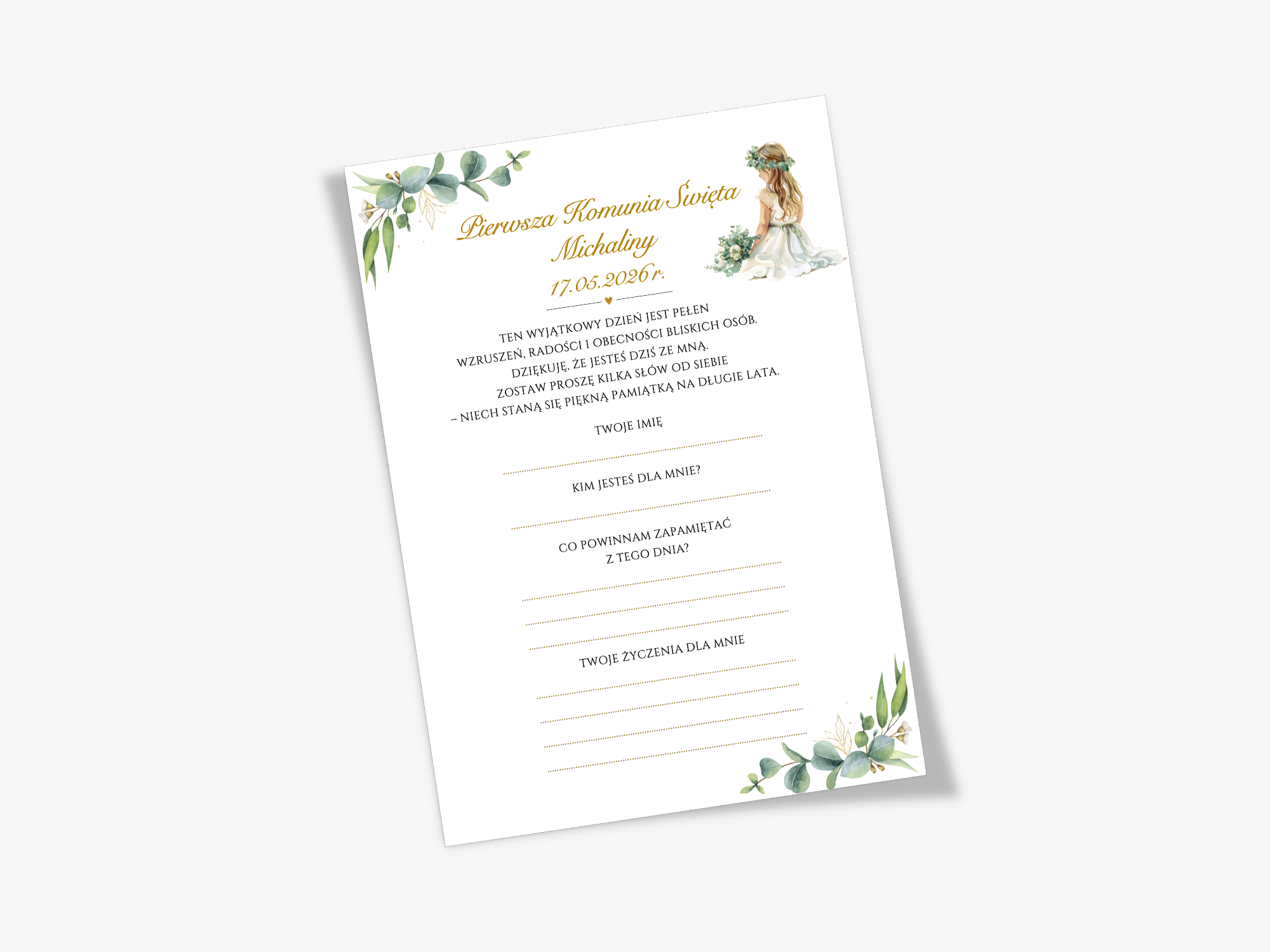 Personalizacja – imię dziecka oraz data Komunii sprawiają, że ankieta jest idealnie dopasowana do uroczystości