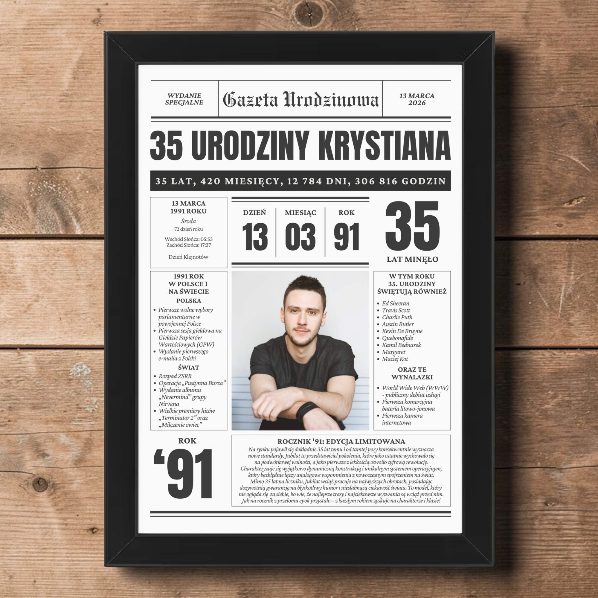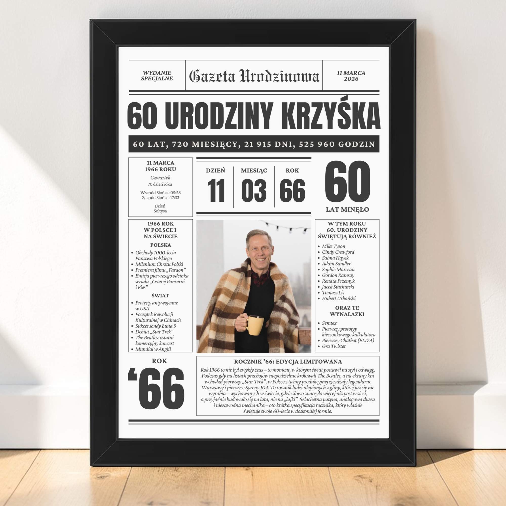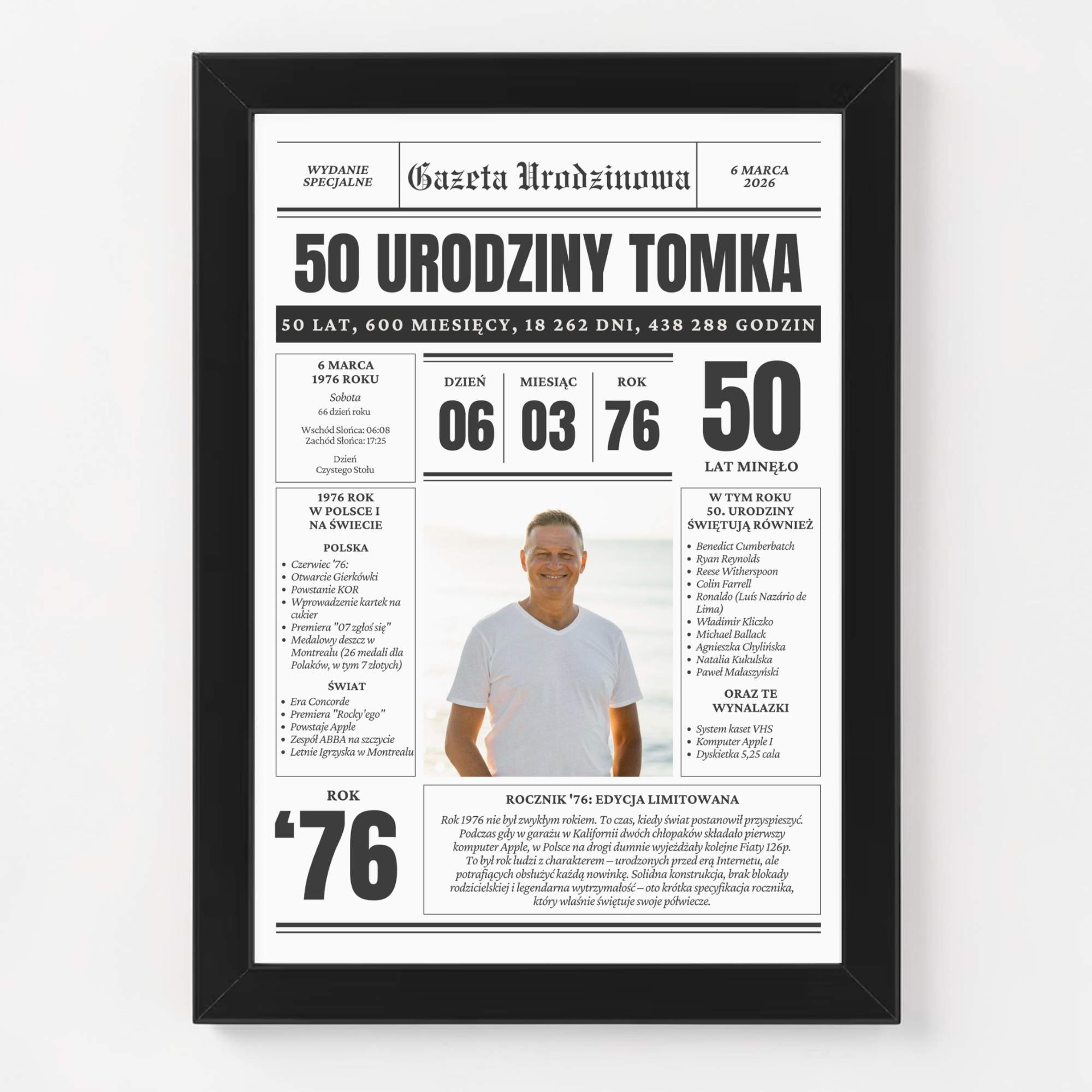 • Pełna Personalizacja: Zdjęcie jubilata na „jedynce” w otoczeniu nagłówków z dnia i roku jego przyjścia na świat.