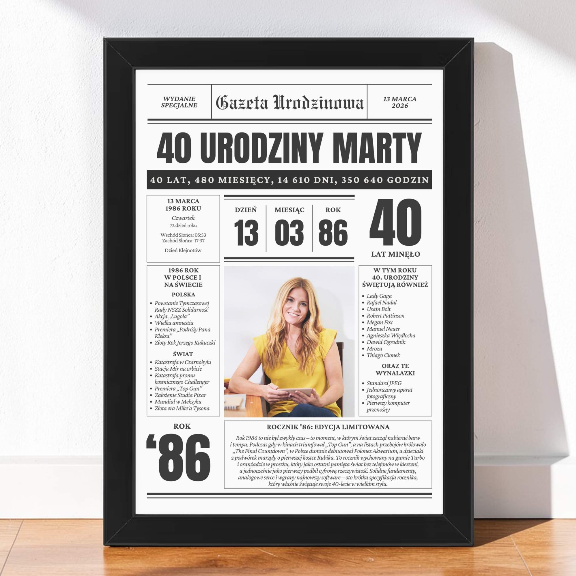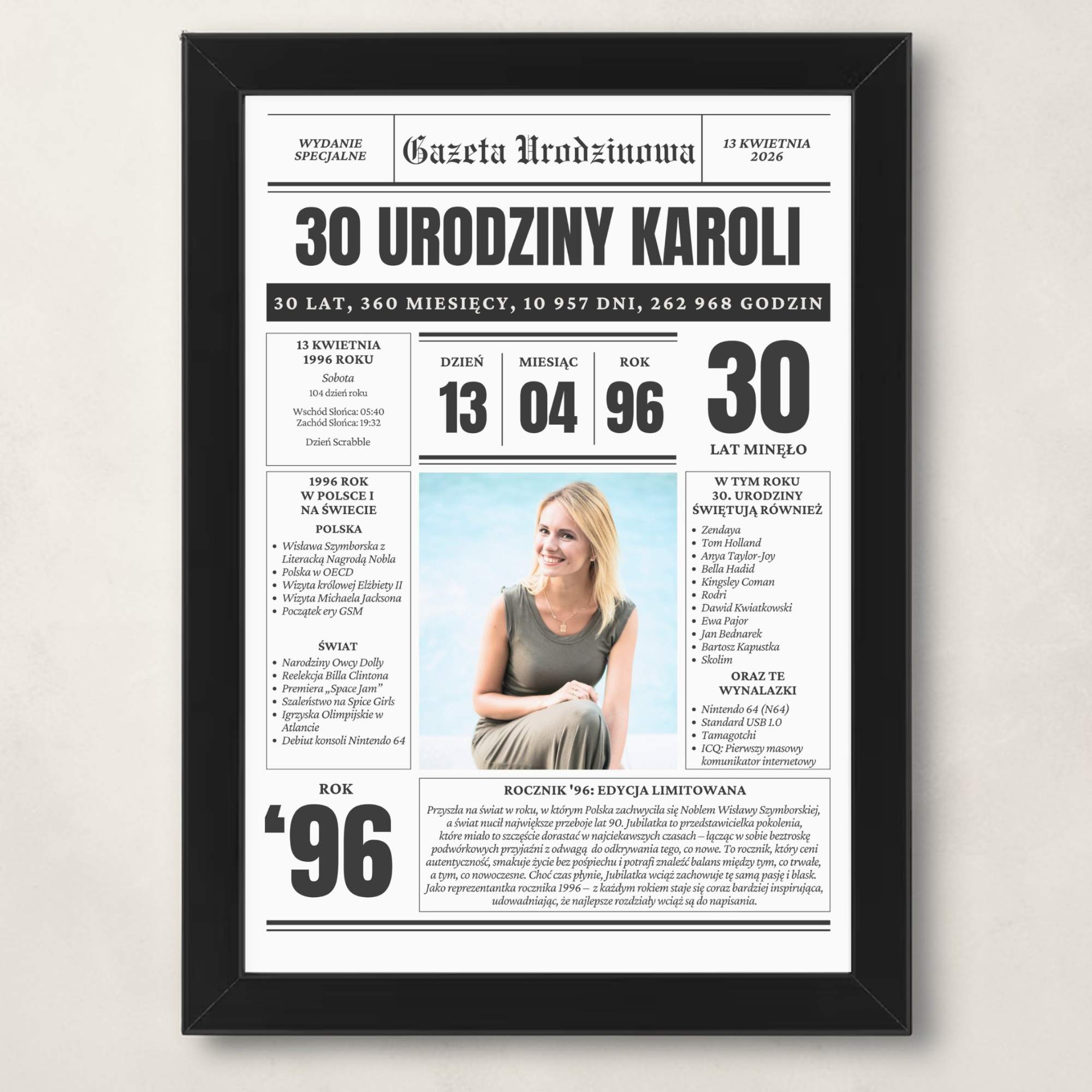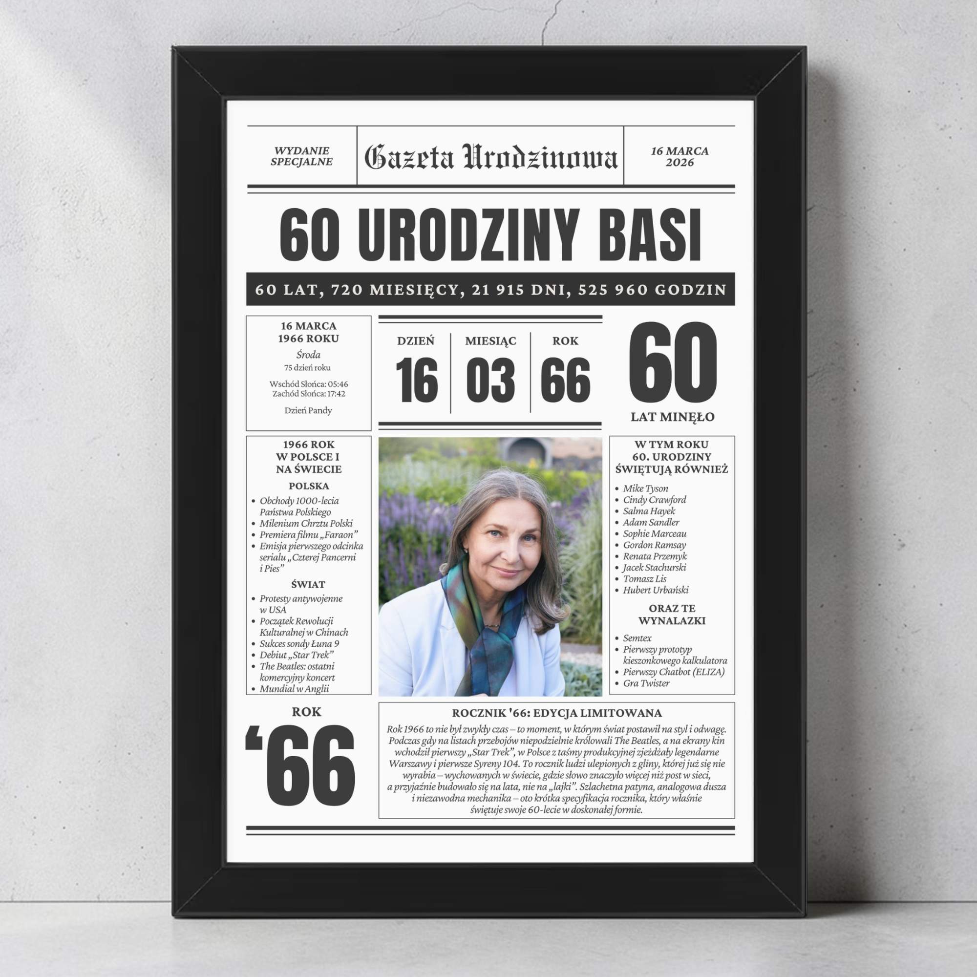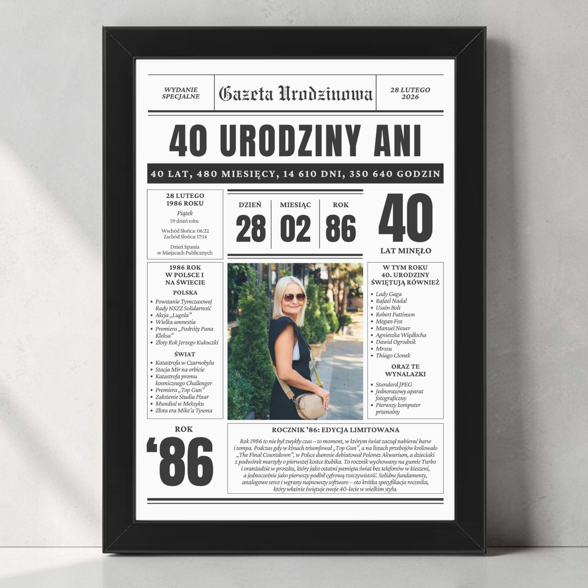 • Pełna Personalizacja: Zdjęcie jubilata na „jedynce” w otoczeniu nagłówków z dnia i roku jego przyjścia na świat.
