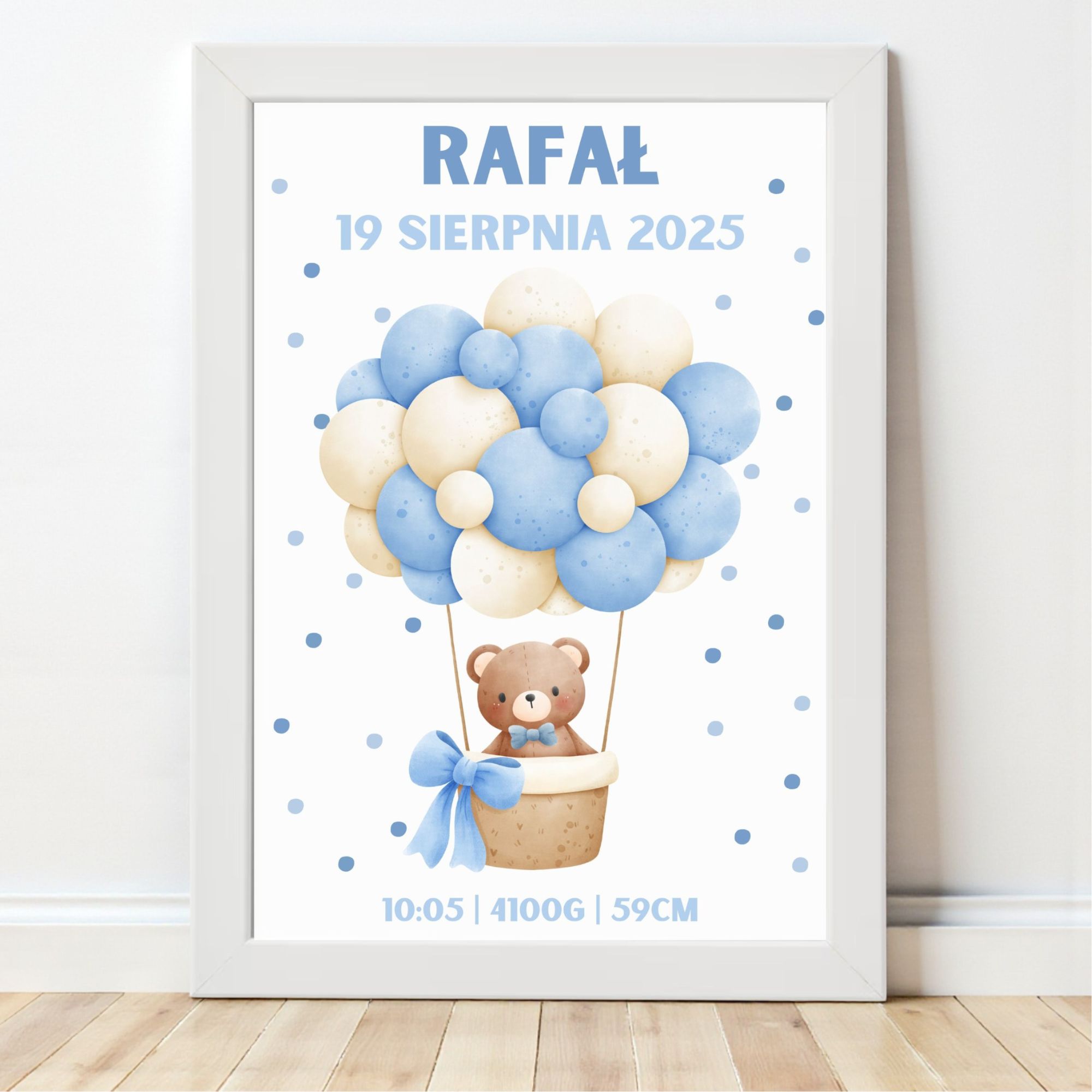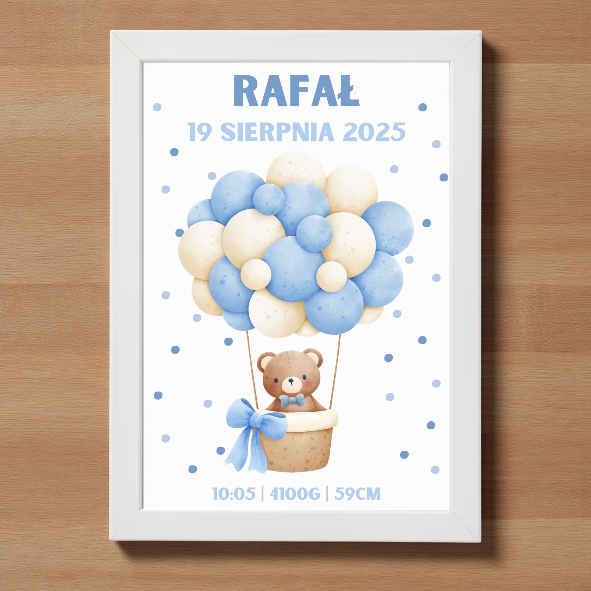 Personalizowana metryczka z misiem lecącym w balonie to wyjątkowa pamiątka z narodzin lub chrztu oraz urocza dekoracja pokoju chłopca. Pastelowe odcienie błękitu, lekki motyw kropeczek i kompozycja wielu balonów tworzą pogodny i radosny klimat. Taki plakat będzie piękną pamiątką, która pozostanie z rodziną na lata.