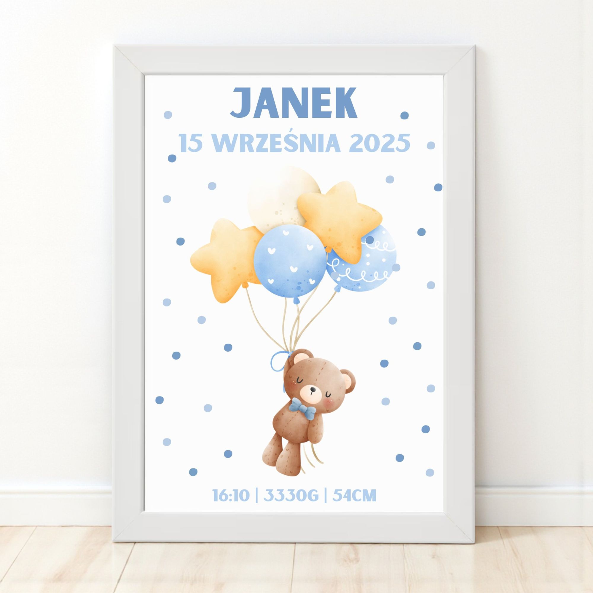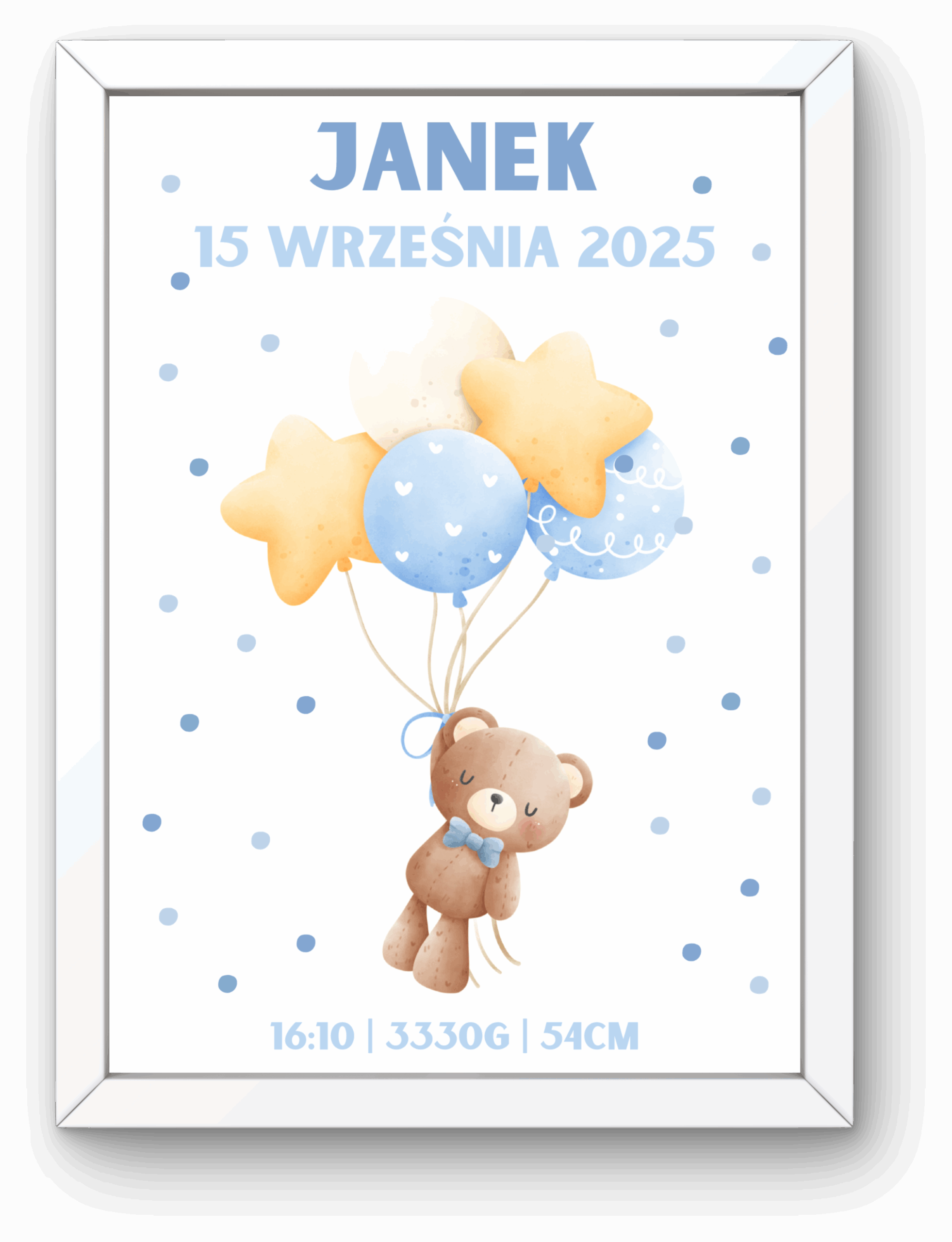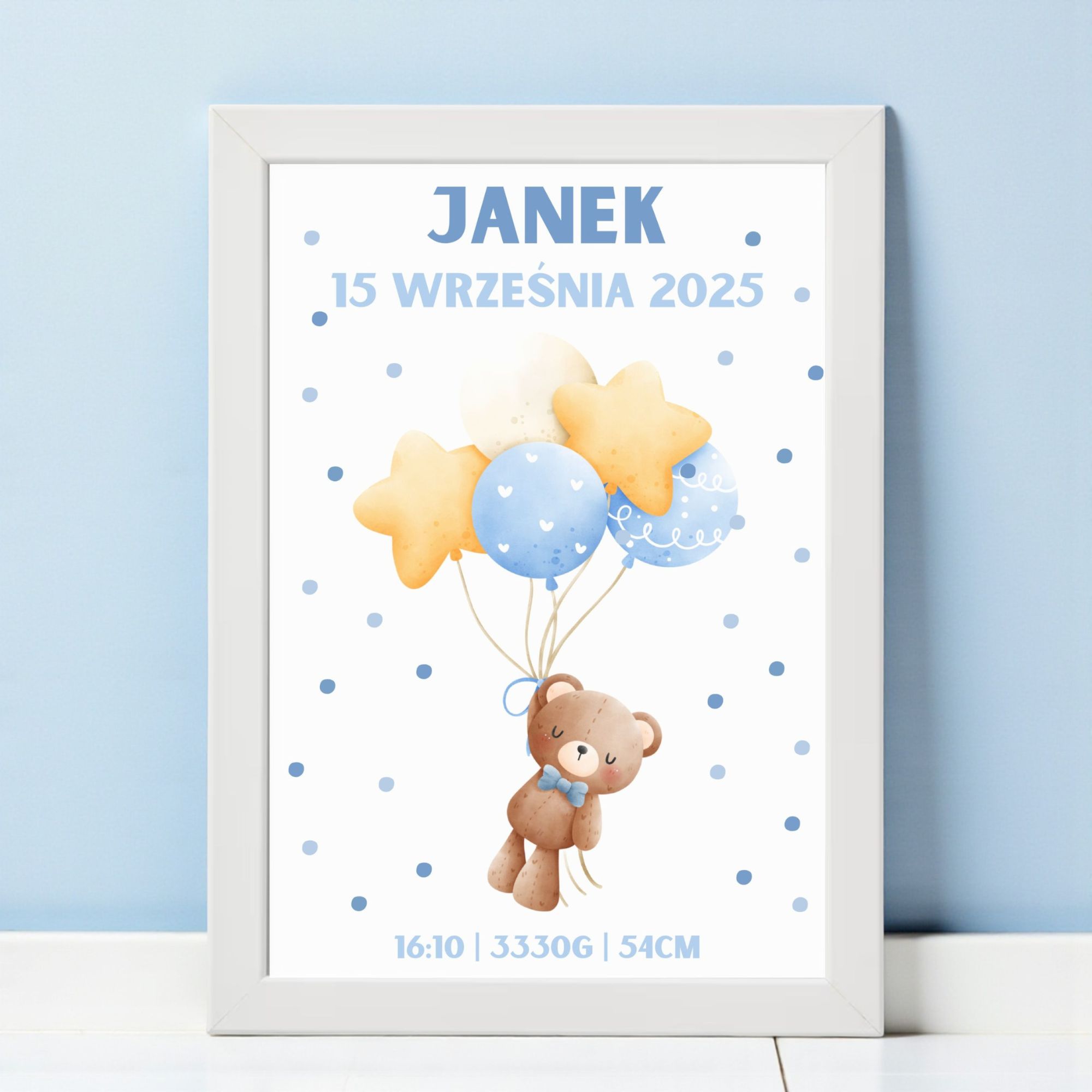 Personalizowana metryczka z misiem trzymającym balony to wyjątkowa pamiątka z narodzin lub chrztu oraz urocza dekoracja pokoju chłopca. Pastelowe odcienie błękitu i delikatne kropeczki tworzą radosny i lekki klimat. Taka metryczka będzie piękną pamiątką, która pozostanie z rodziną na długie lata.