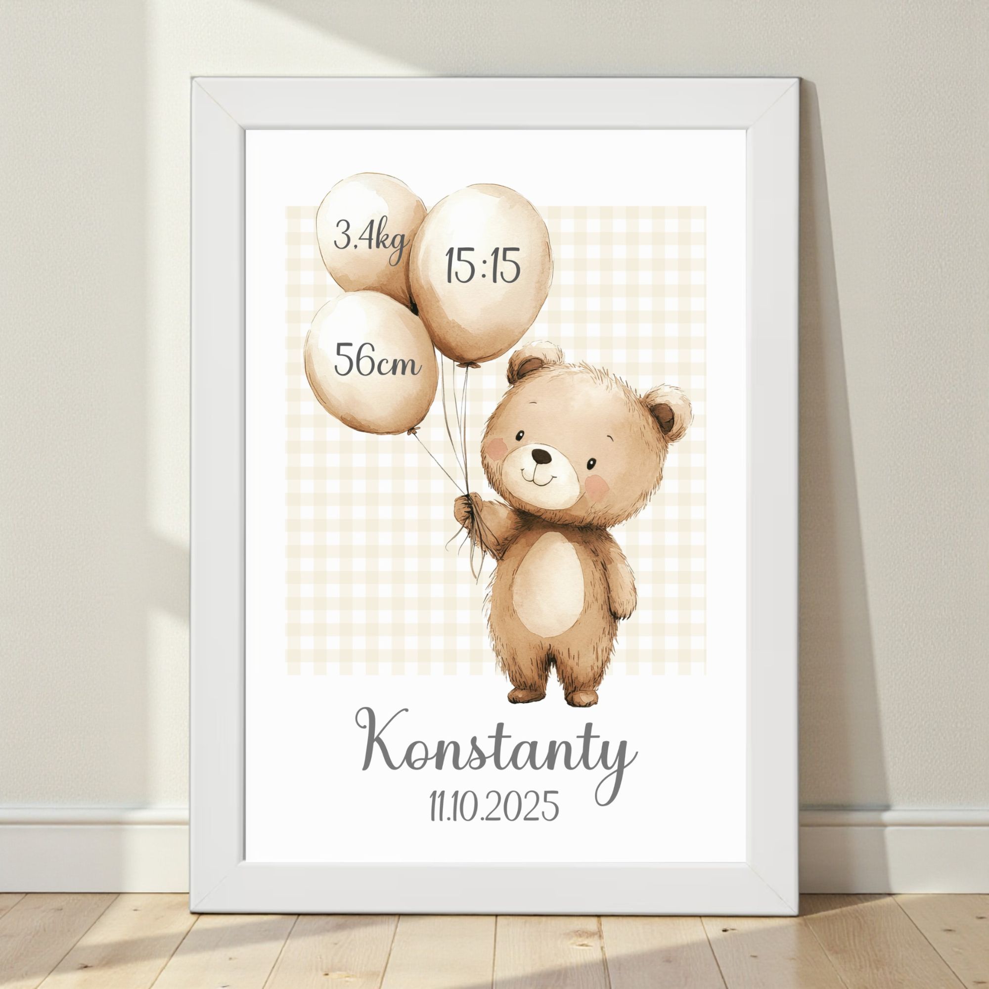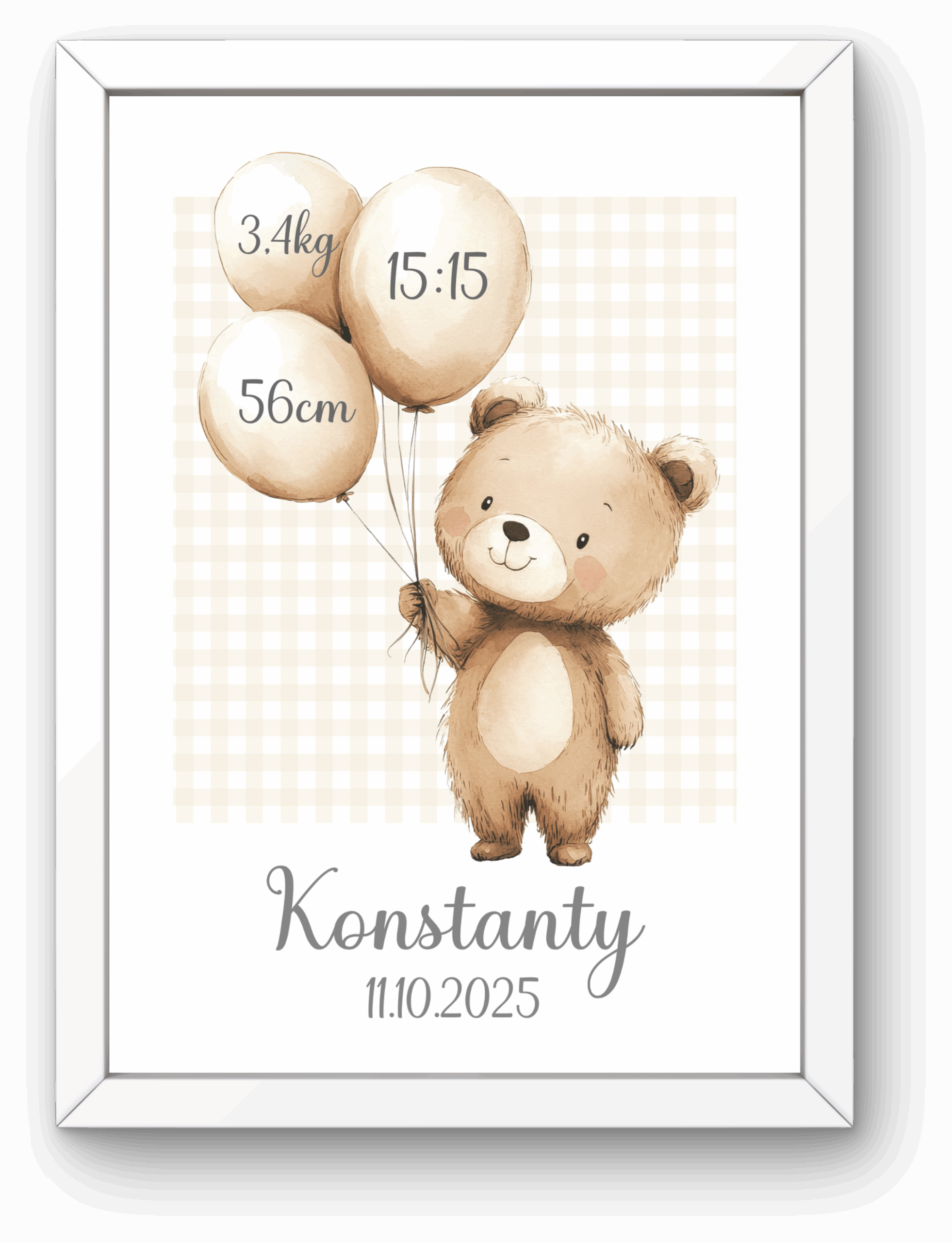 Personalizowana metryczka z uroczym misiem i balonami w beżowej kolorystyce to wyjątkowa pamiątka narodzin lub chrztu dziecka. Delikatny, neutralny motyw kratki sprawia, że plakat idealnie pasuje do pokoju maluszka w każdym stylu — zarówno klasycznym, jak i nowoczesnym.