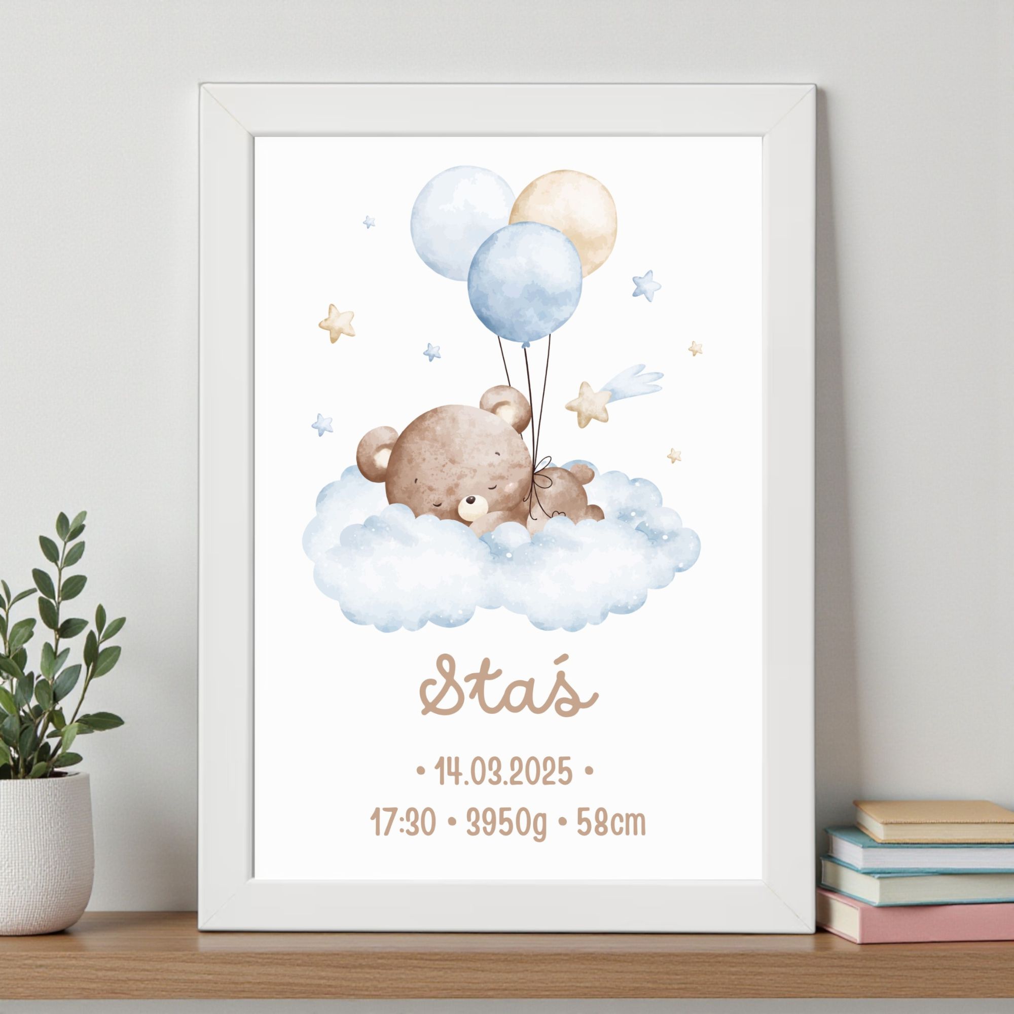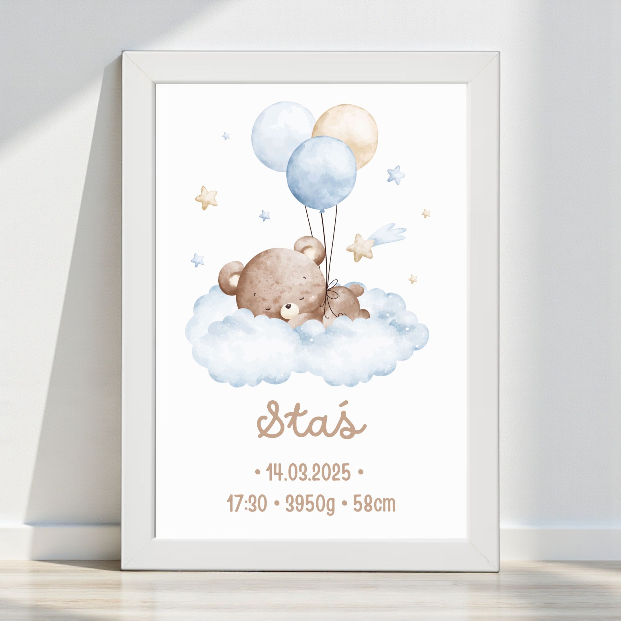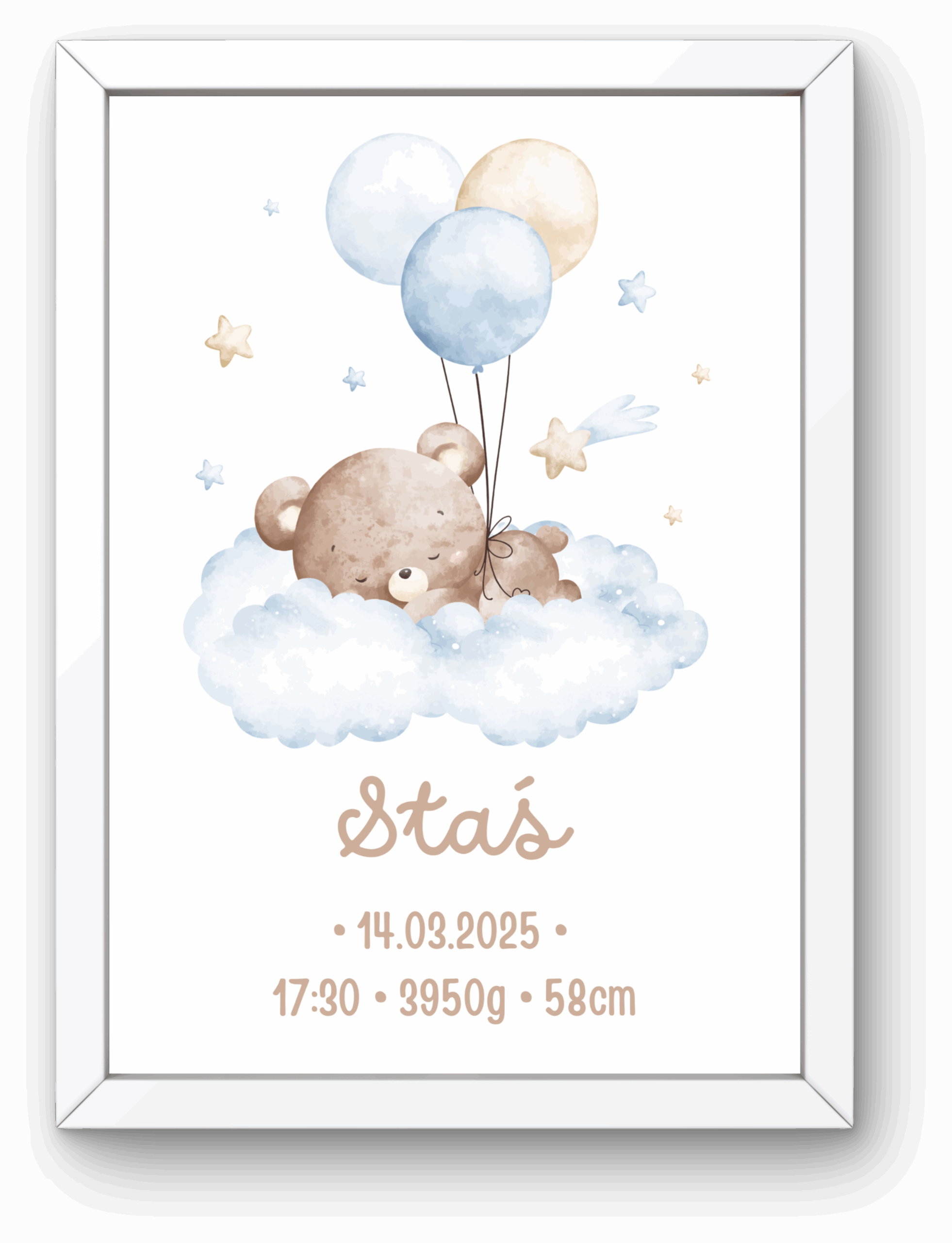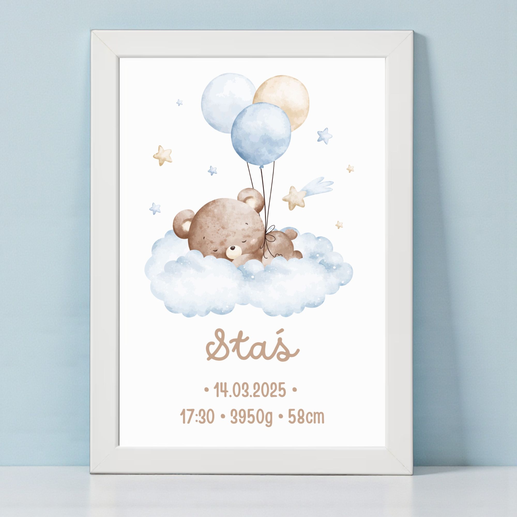 Napisz pierwszą opinię o „Metryczka dla Chłopca z Ramką – Śpiący Miś na Chmurce z Balonami”