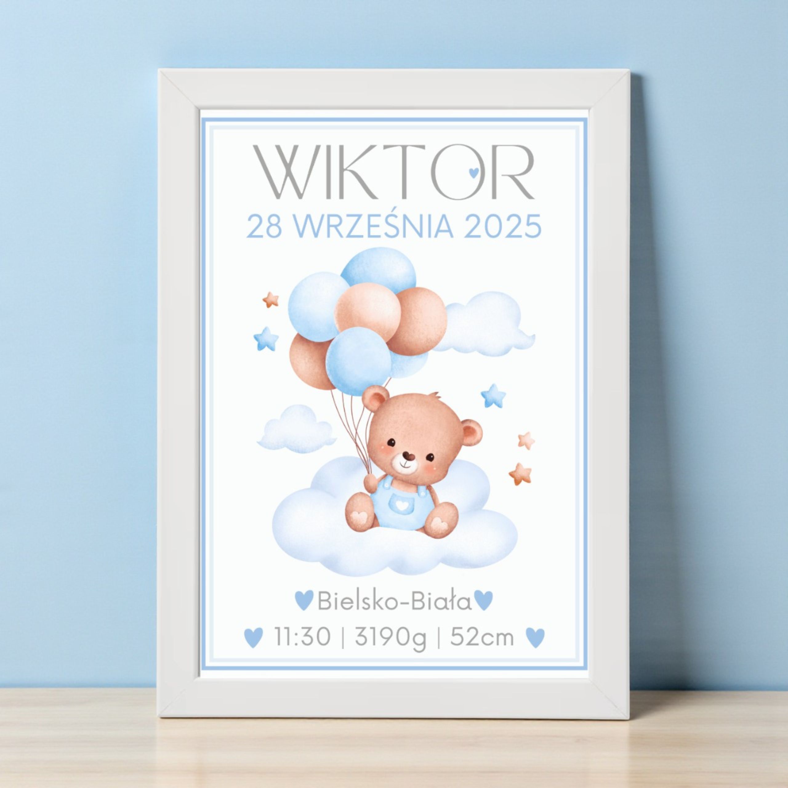 Metryczka dla chłopca A4 + Biała Ramka Ikea FISKBO