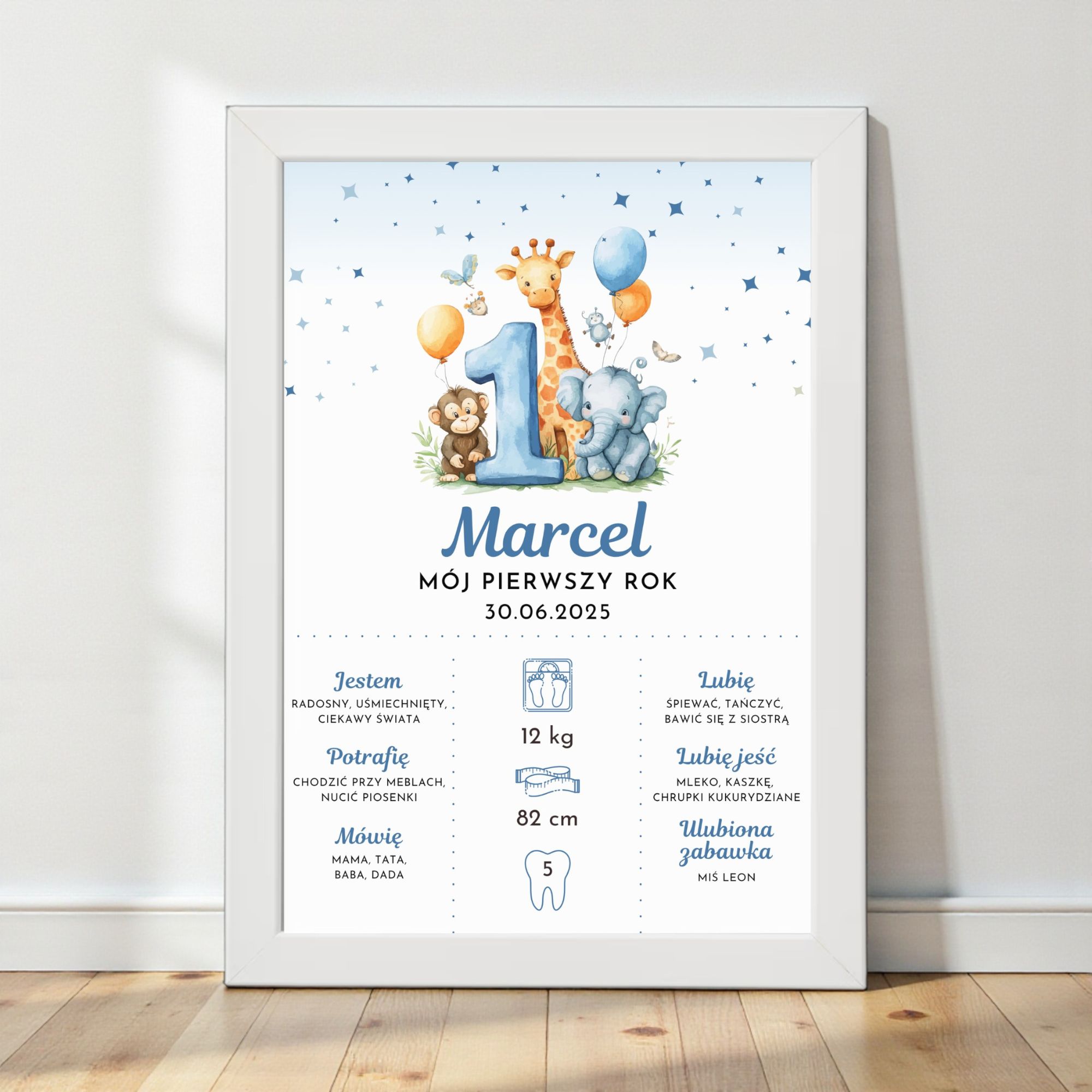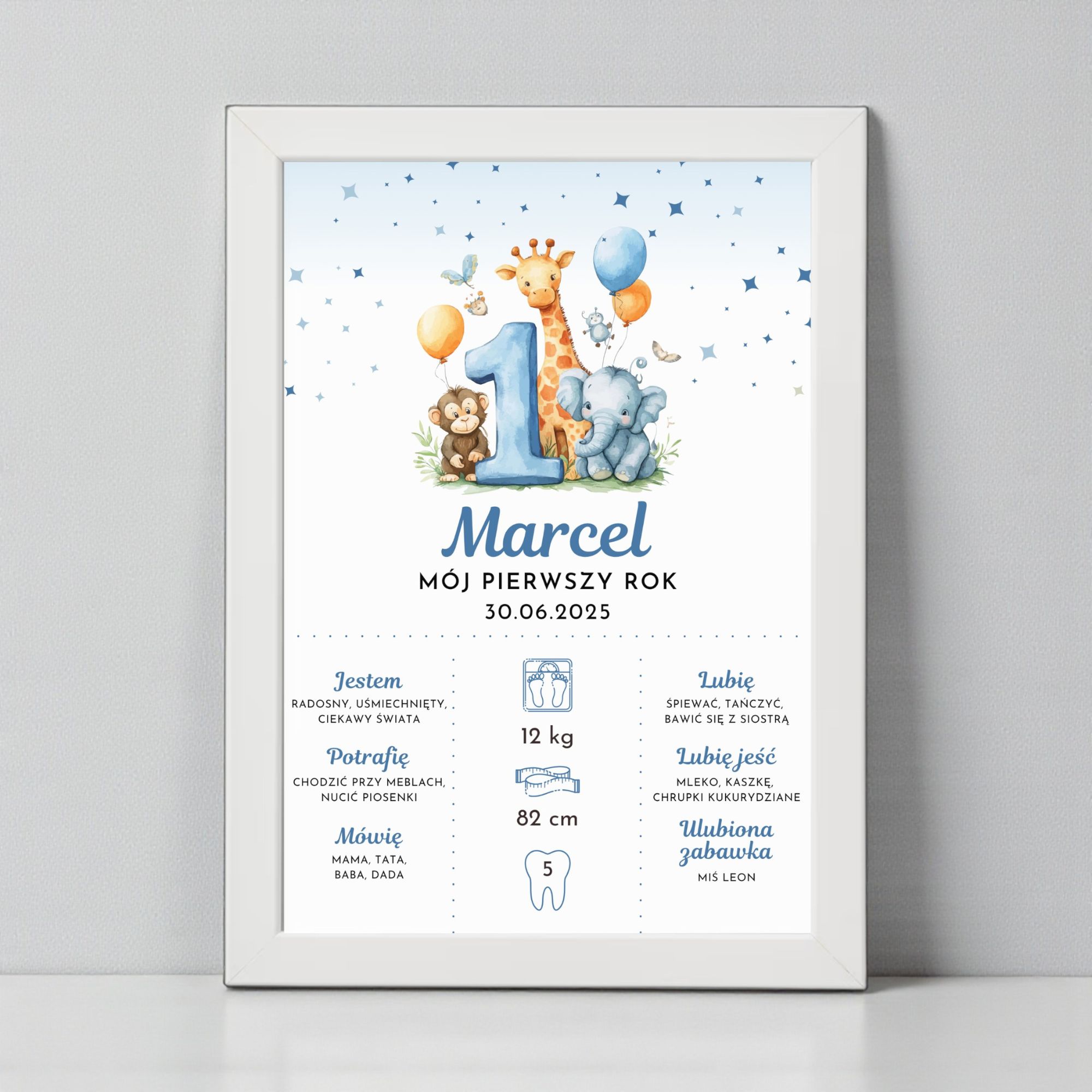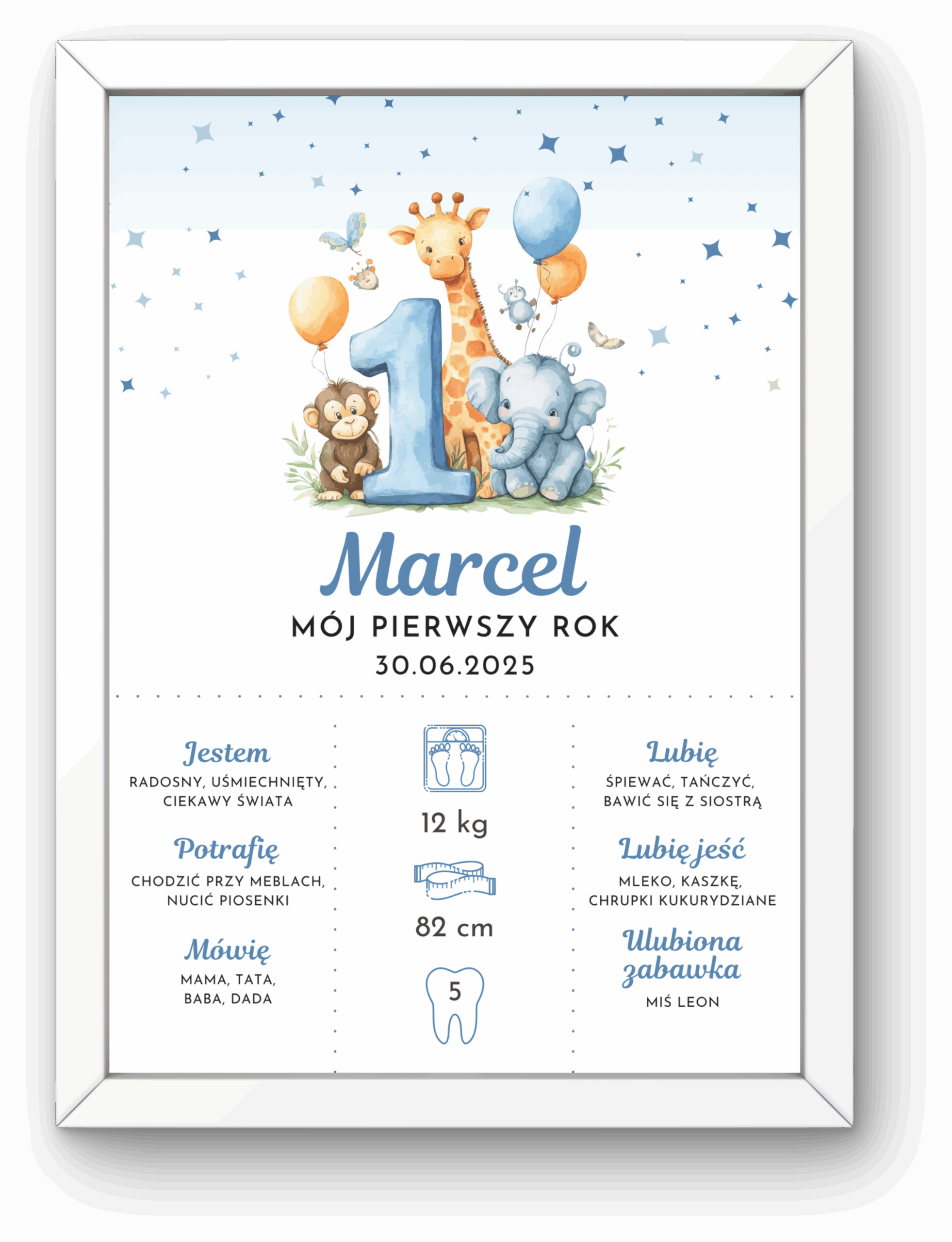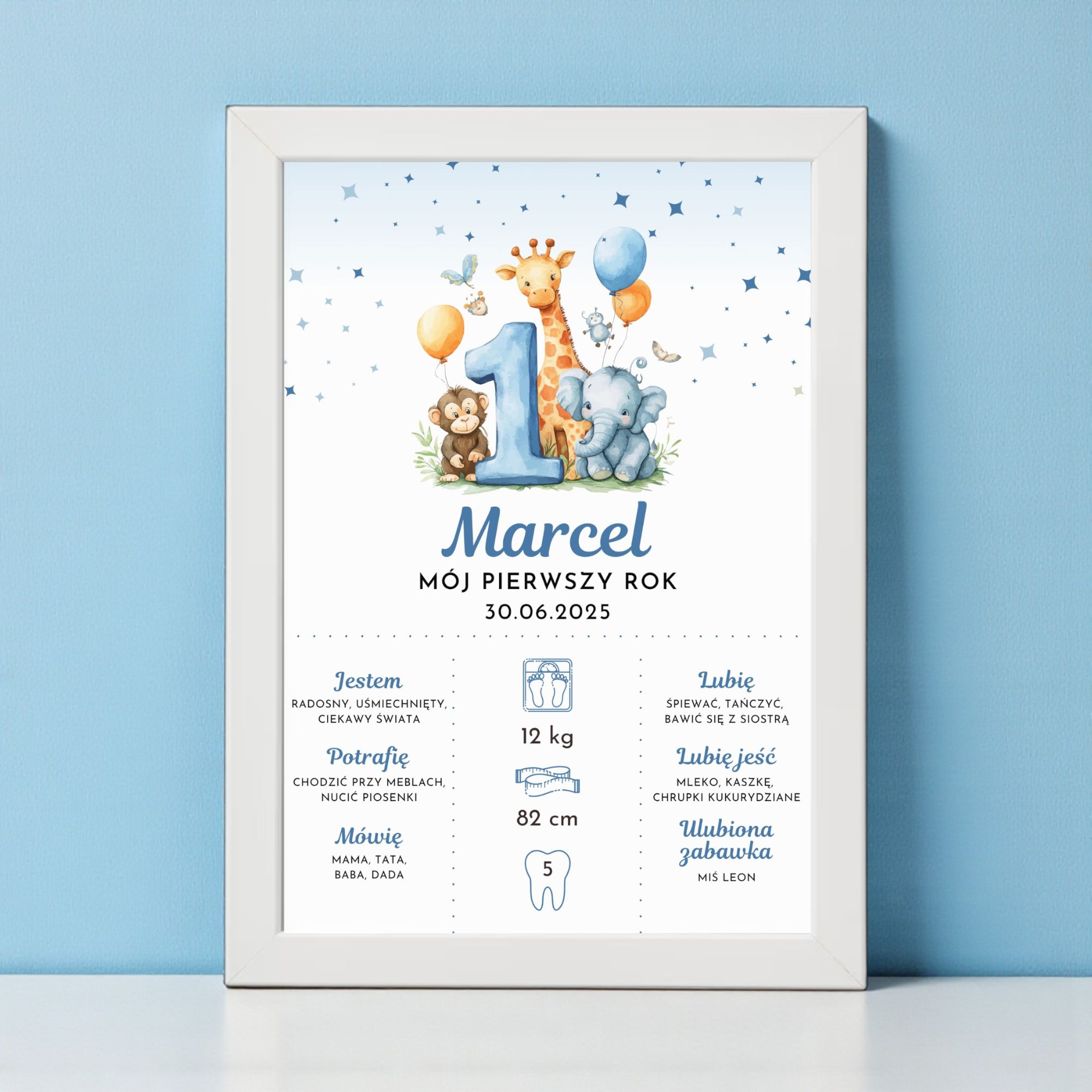 Personalizowana metryczka „Mój Pierwszy Rok” to urocza pamiątka pierwszych 12 miesięcy życia dziecka oraz wyjątkowa dekoracja pokoiku. Pastelowa kolorystyka i słodkie ilustracje tworzą radosny, dziecięcy klimat, idealny na ścianę w pokoju malucha.