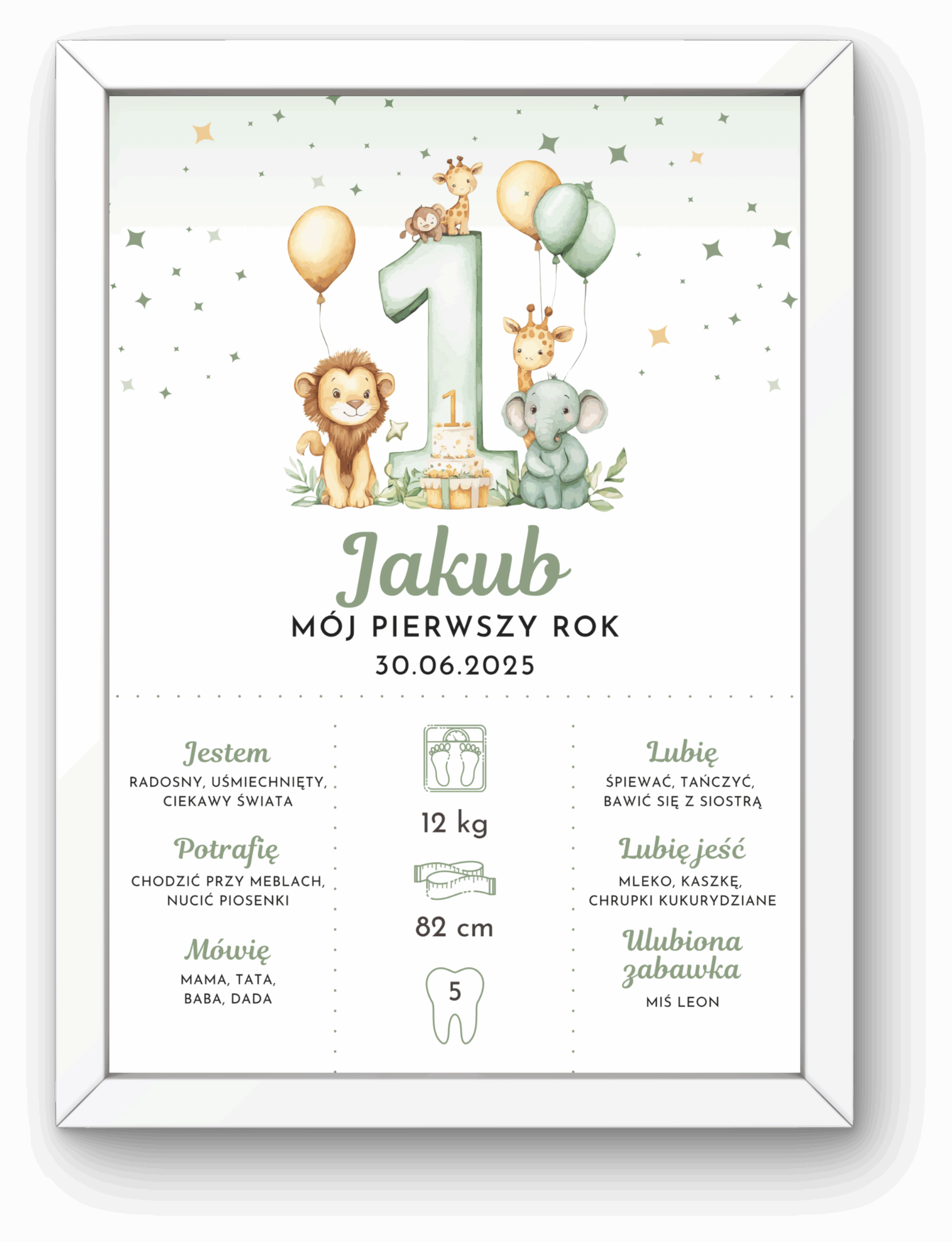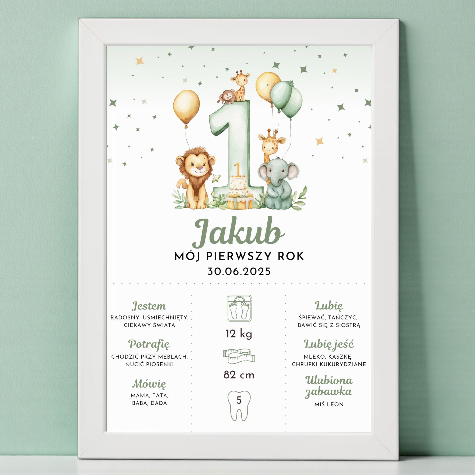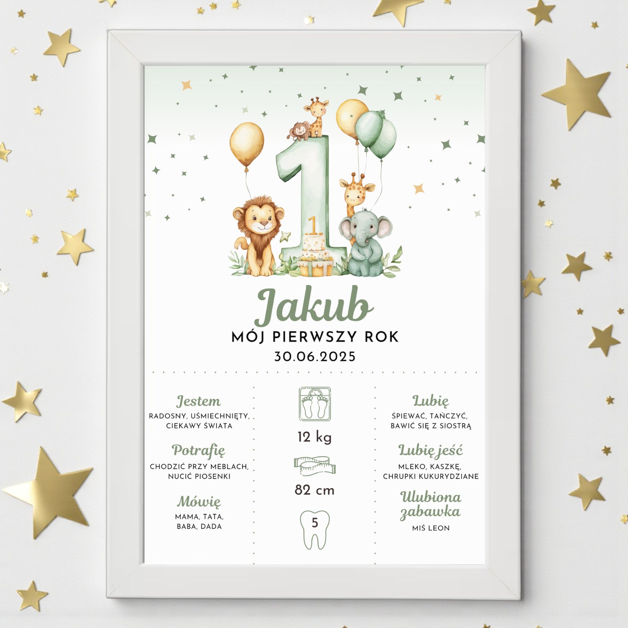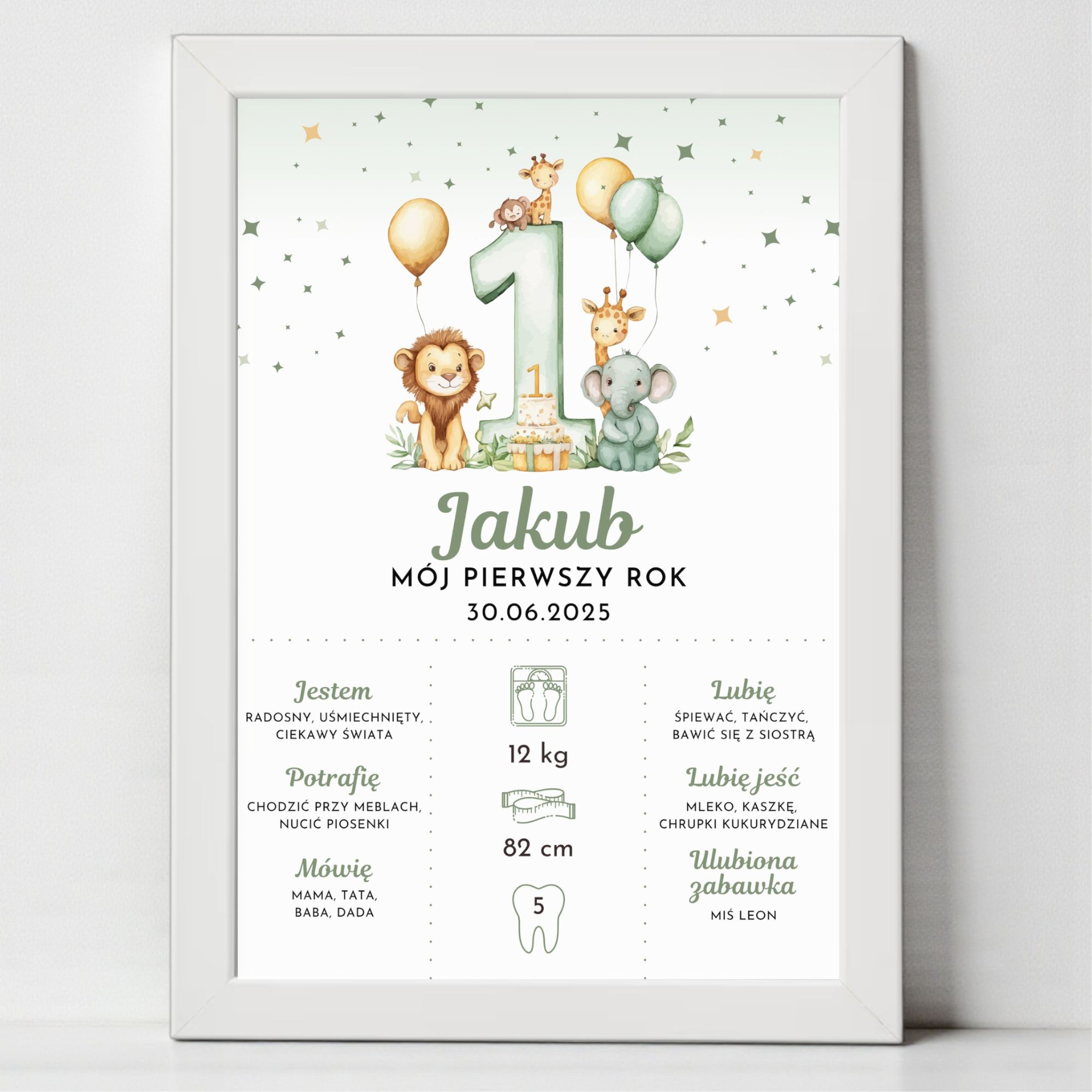 Kolaż „MÓJ PIERWSZY ROK” A4 + Biała Ramka IKEA FISKBO – Zielony Motyw Safari