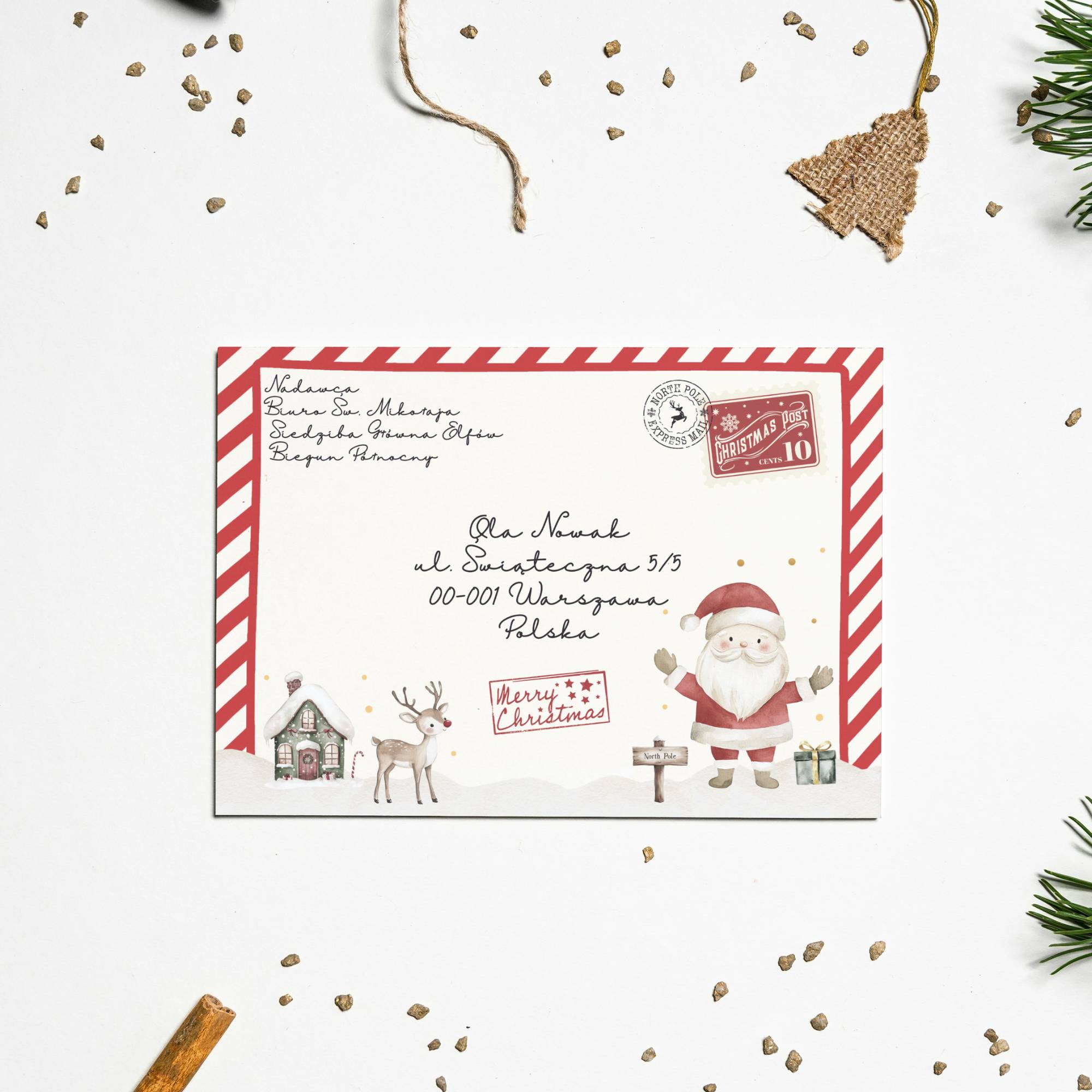 Świąteczna koperta C5 – pełny nadruk, ilustracje, stempel „North Pole Express Mail”, personalizacja adresowa