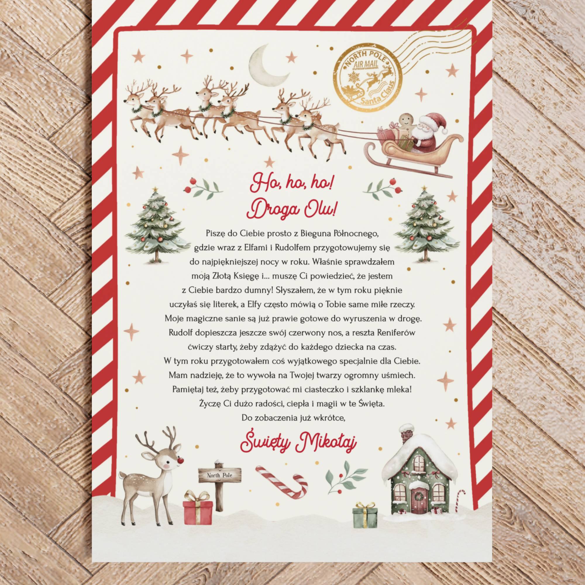 Indywidualnie przygotowany list od Świętego Mikołaja wywoła ogromny uśmiech, emocje i poczucie wyjątkowości. Każdy egzemplarz zawiera imię dziecka, dopasowaną pochwałę, specjalną prośbę od Mikołaja oraz personalizowaną kopertę z nadrukiem.