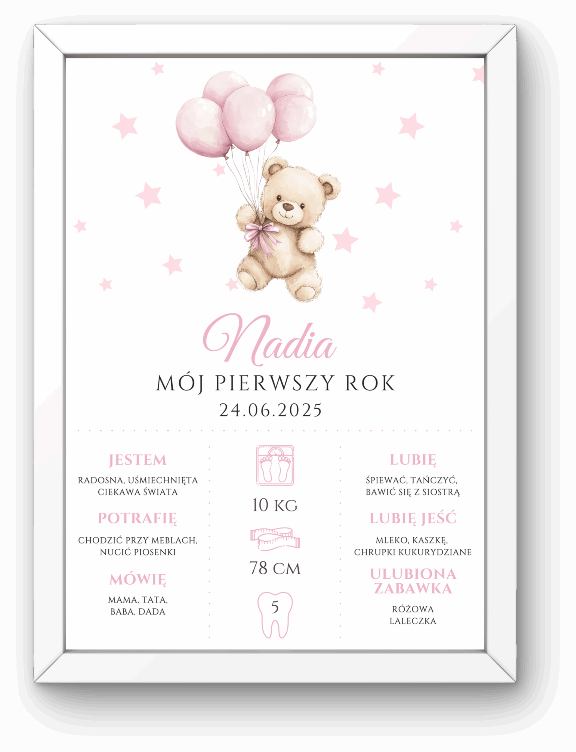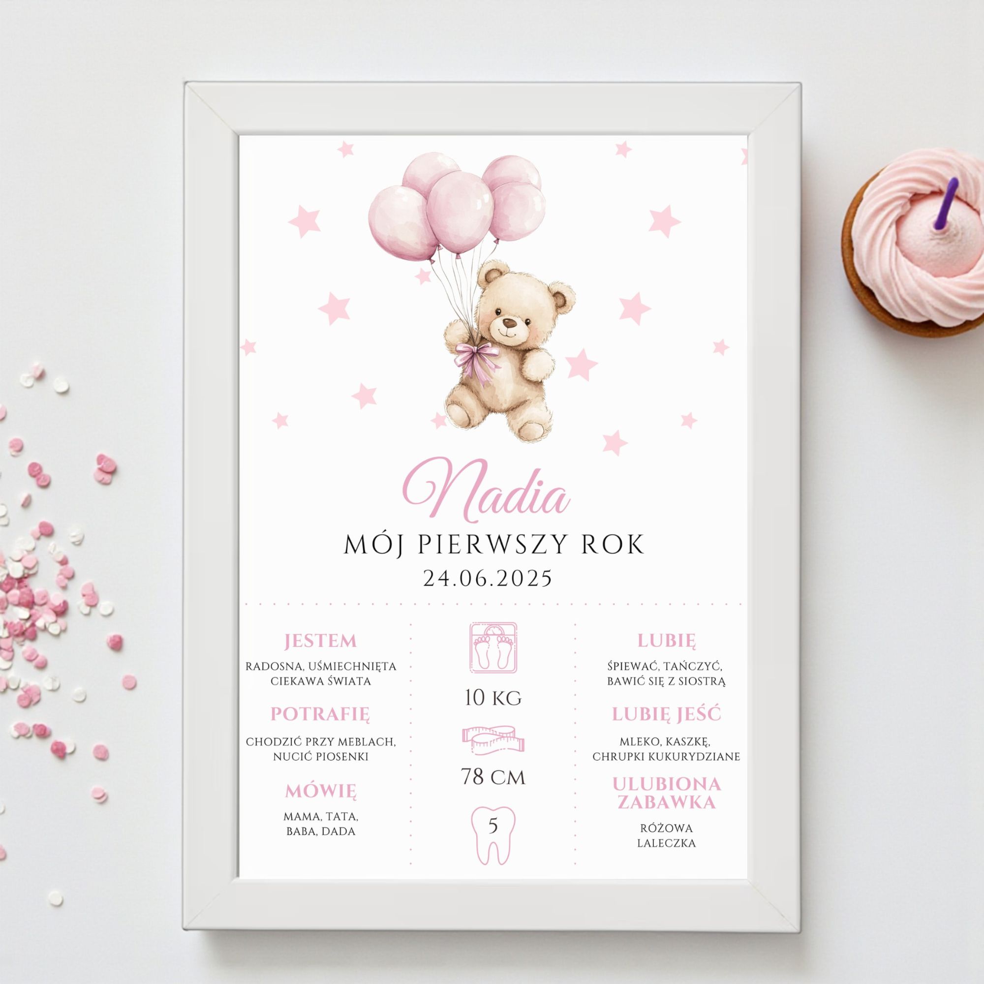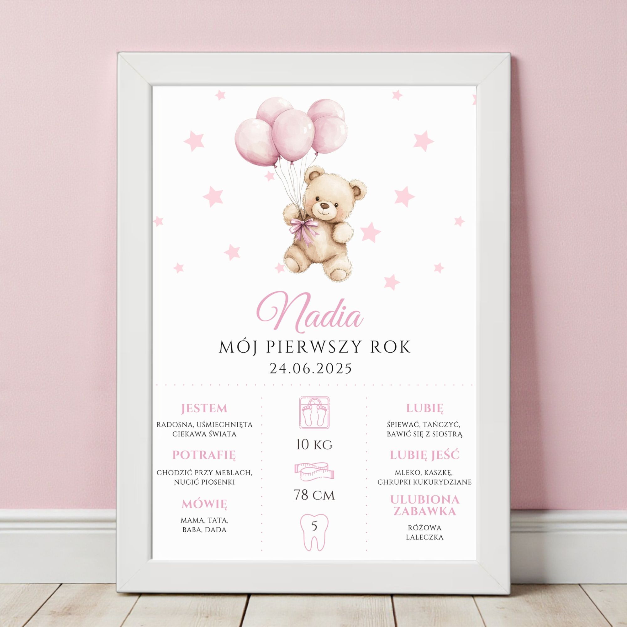 Plakat „MÓJ PIERWSZY ROK” A4 + Biała Ramka IKEA FISKBO – Różowy Miś z Balonami