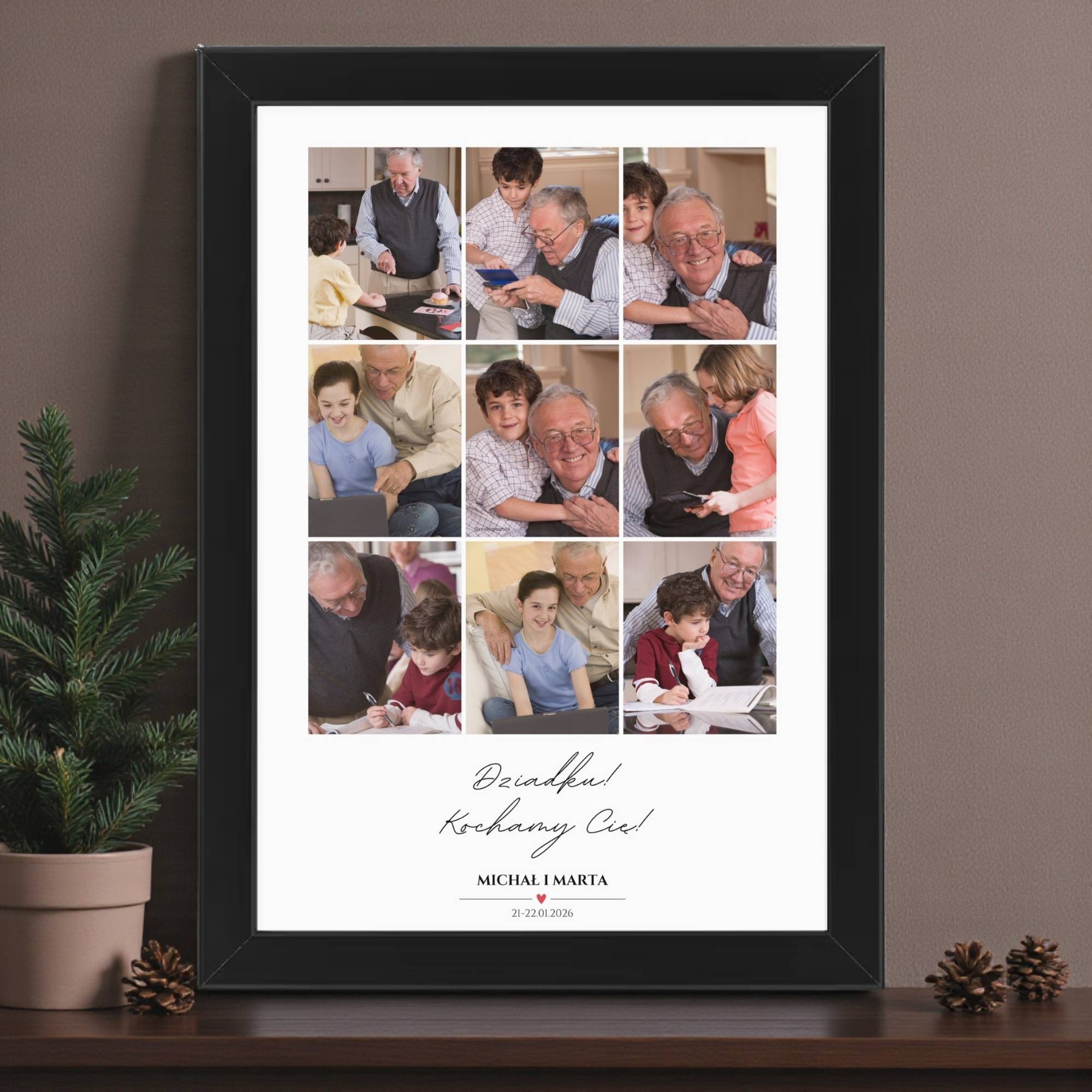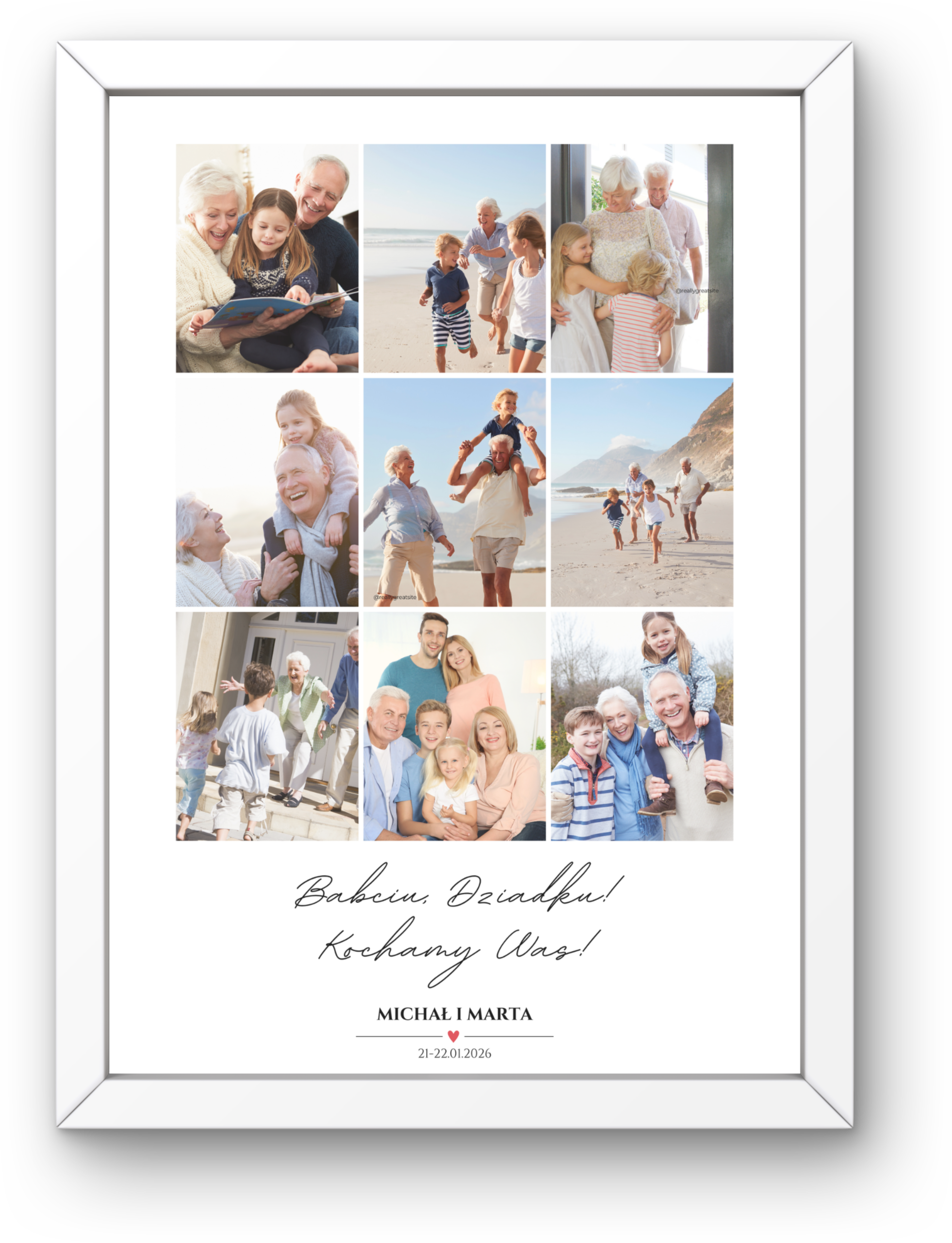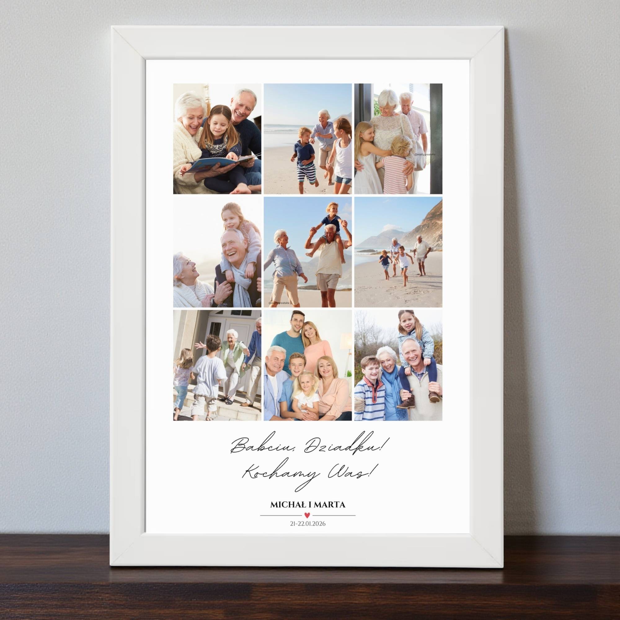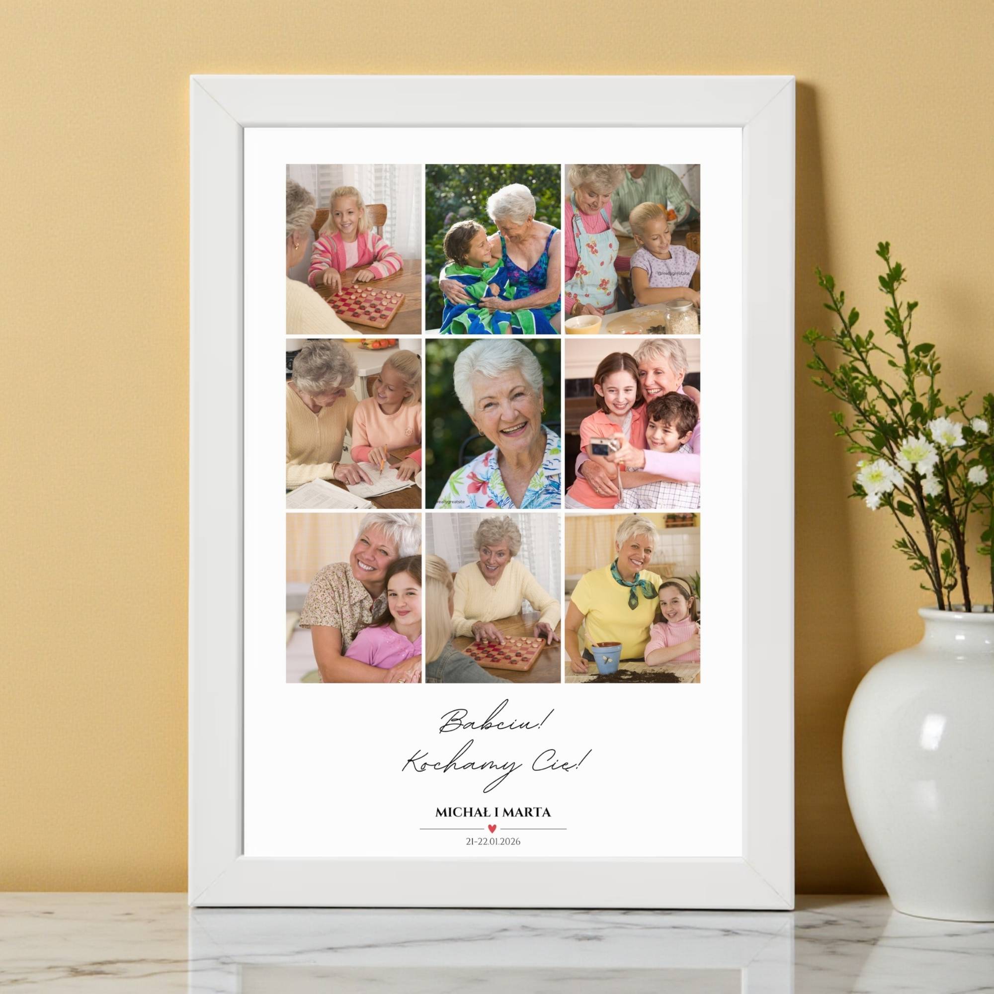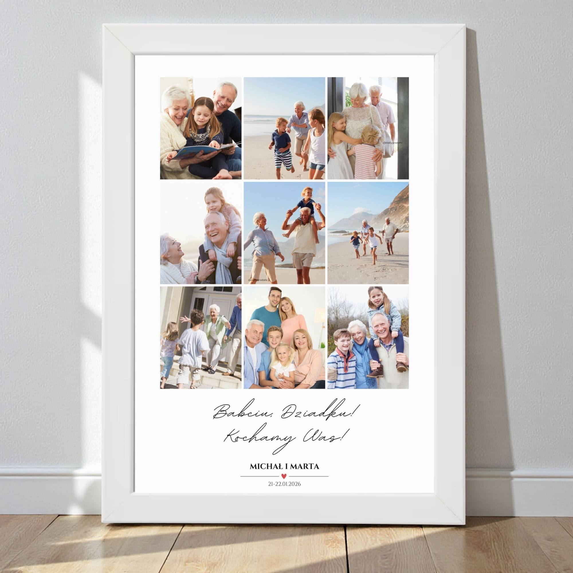 Wyjątkowy, personalizowany plakat ze zdjęć to wzruszająca pamiątka, która pięknie oddaje wspólne chwile i rodzinne emocje. Kompozycja z kilku fotografii w eleganckim układzie tworzy harmonijną całość, idealną na Dzień Babci i Dziadka, urodziny lub bez okazji – po prostu z miłości 🤍