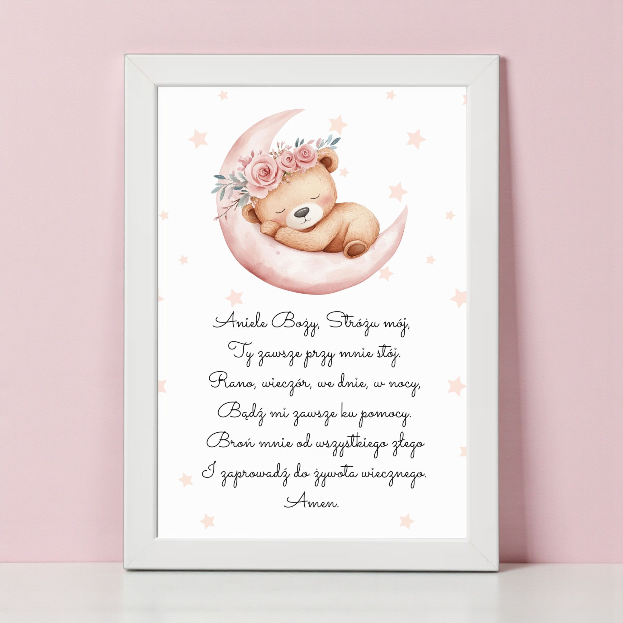 Uroczy plakat z modlitwą „Aniele Boży, Stróżu mój” to piękna dekoracja pokoju dziecka oraz wyjątkowa, symboliczna pamiątka na wiele lat. Motyw śpiącego misia na różowym księżycu, ozdobionego kwiatową opaską i otoczonego delikatnymi gwiazdkami, tworzy ciepły, spokojny i pełen miłości klimat — idealny do dziecięcej przestrzeni. Doskonale wpasuje się w pokój dziewczynki, budując atmosferę bezpieczeństwa i łagodności.