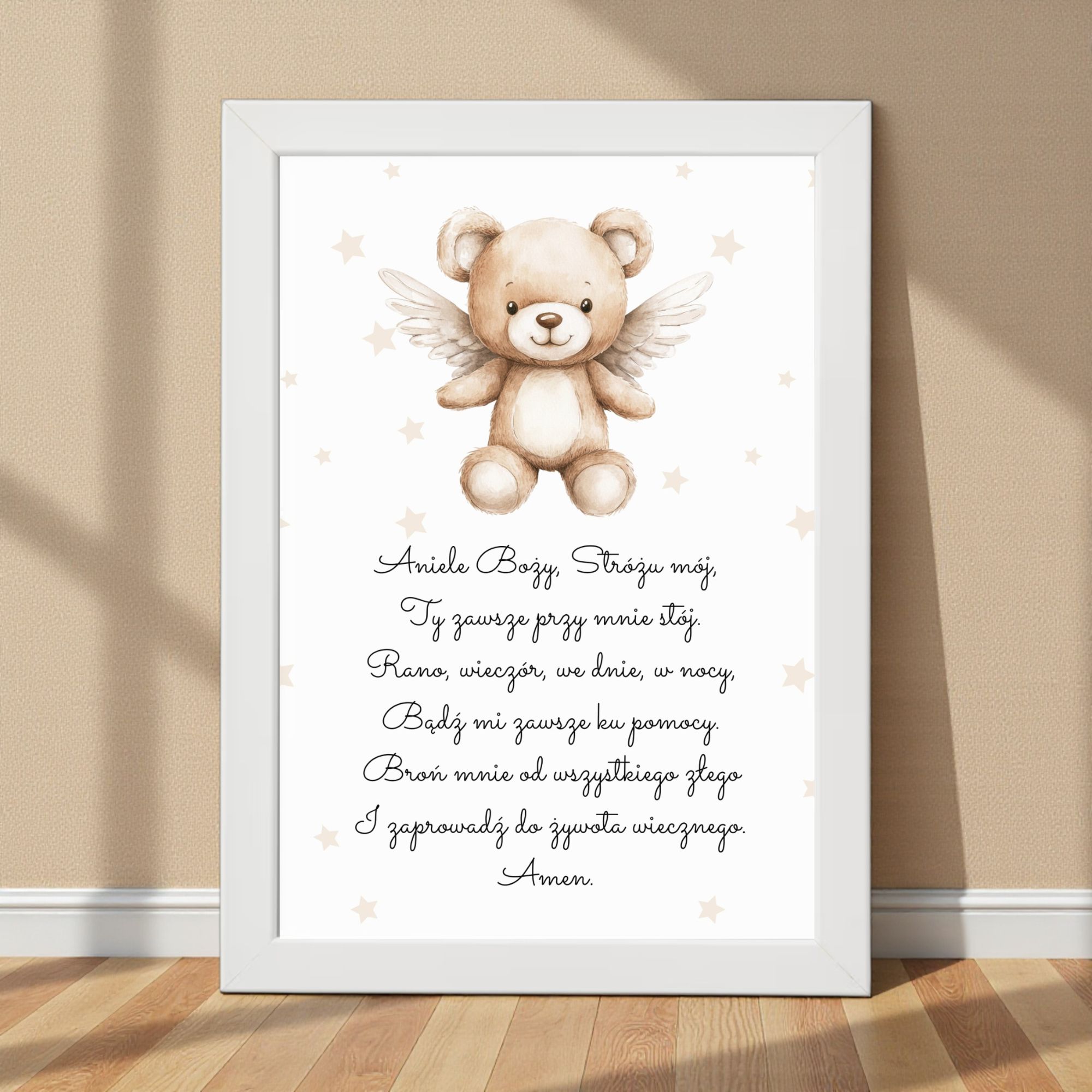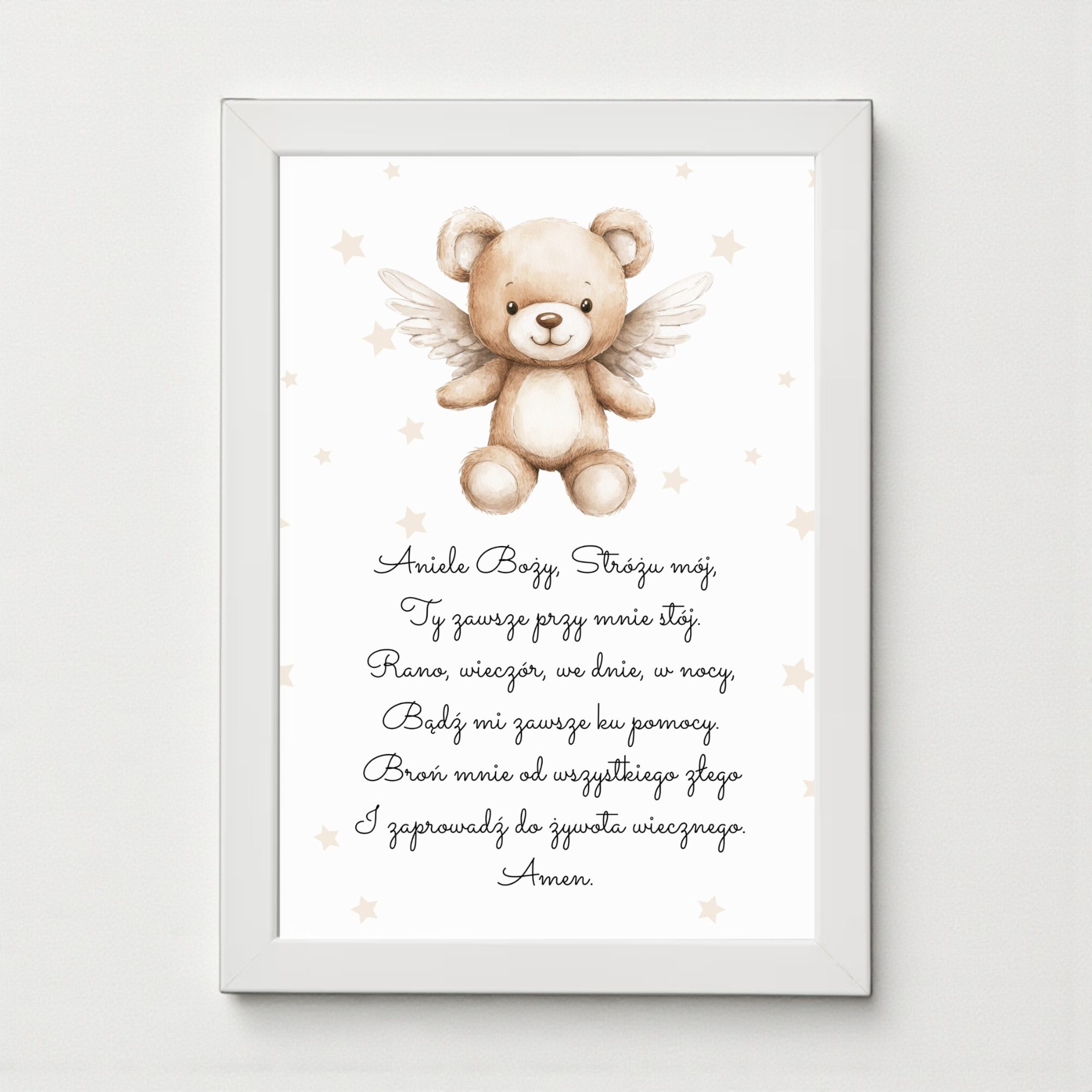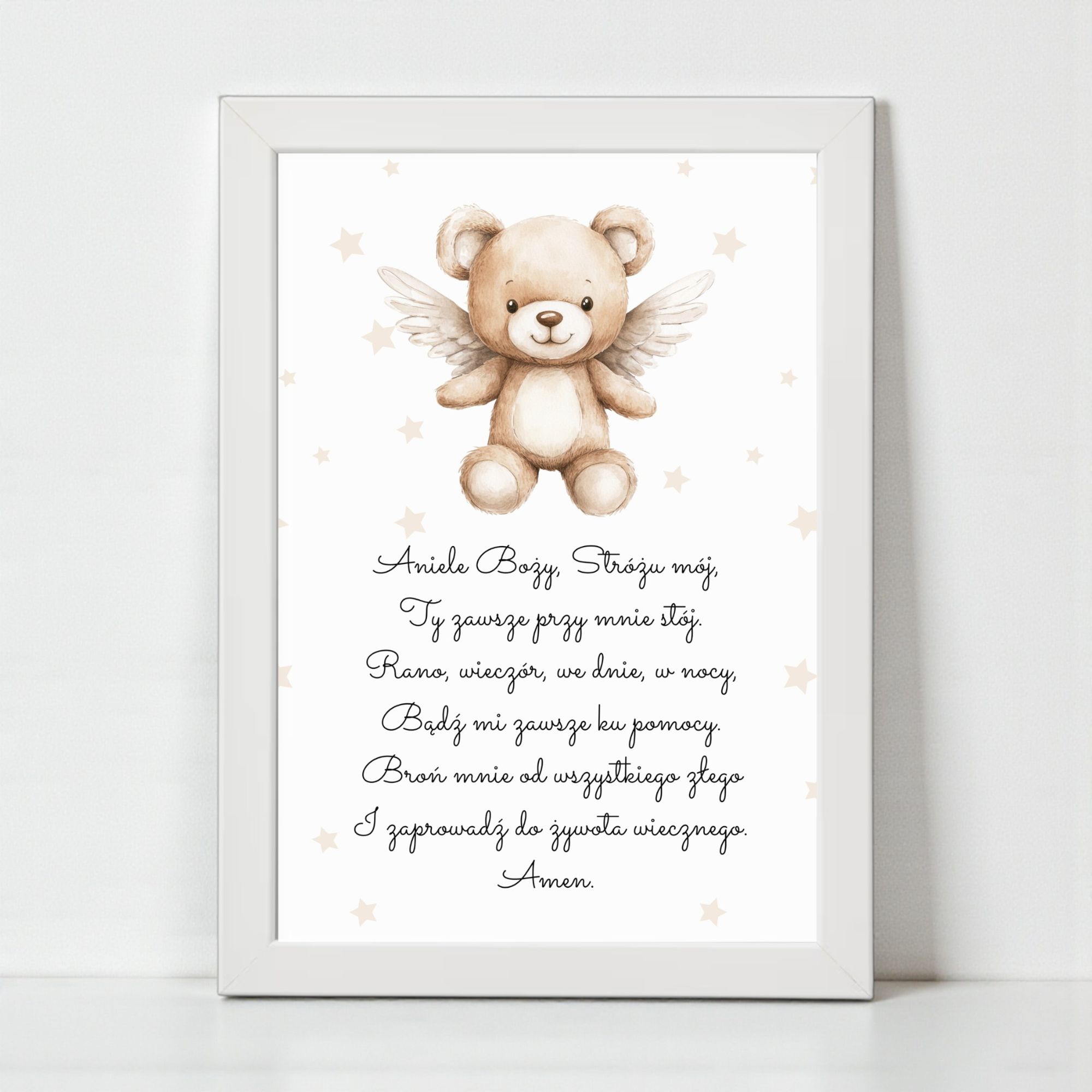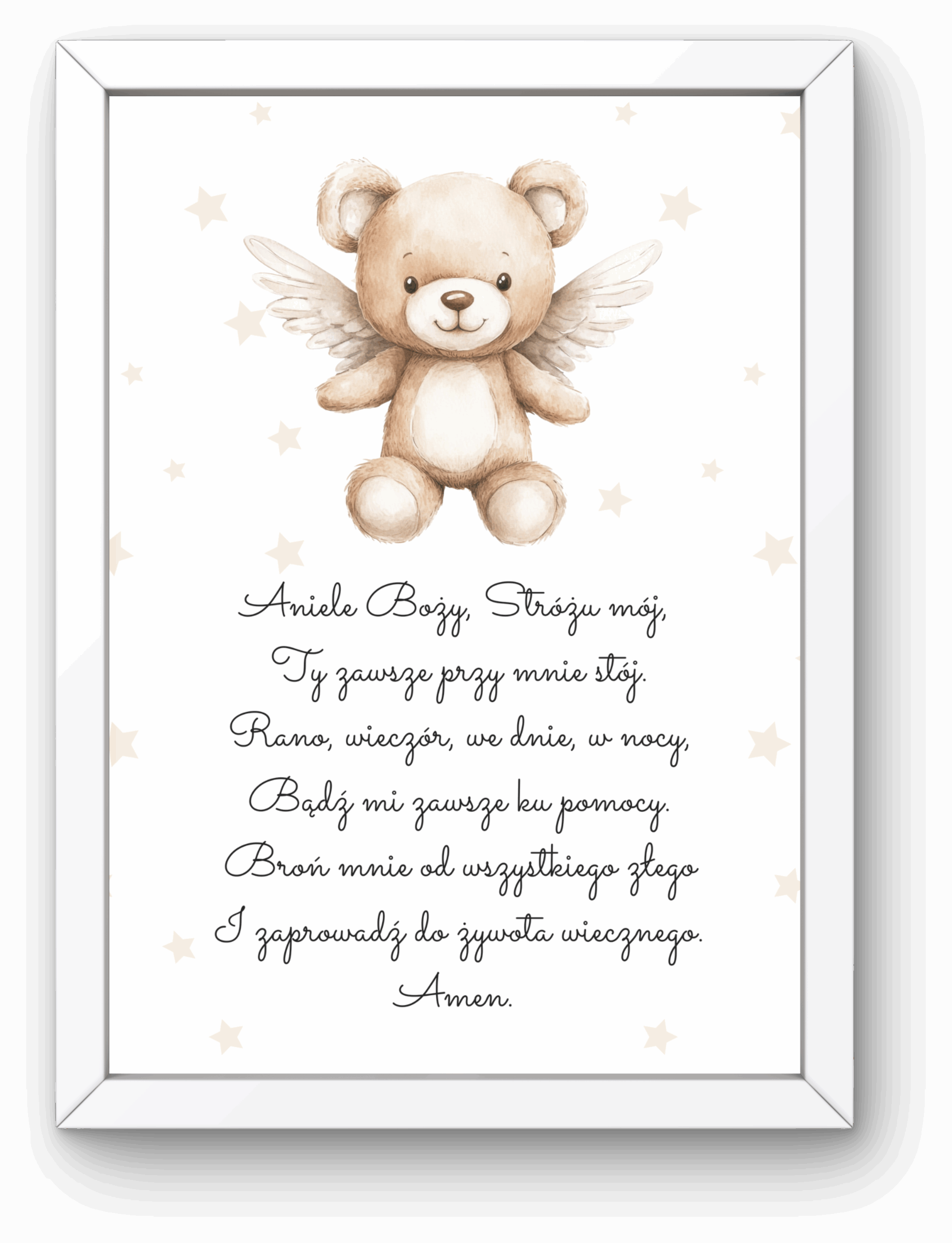 Uroczy plakat z modlitwą „Aniele Boży, Stróżu mój” to wyjątkowa dekoracja pokoju dziecka oraz piękna, symboliczna pamiątka na lata. Motyw misia z anielskimi skrzydłami, w otoczeniu delikatnych gwiazdek, tworzy pełen ciepła i spokoju klimat, idealny do wnętrza chłopca lub dziewczynki.
