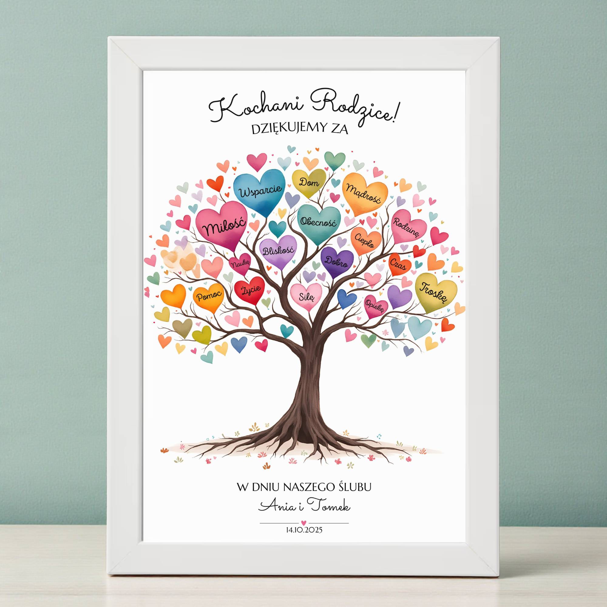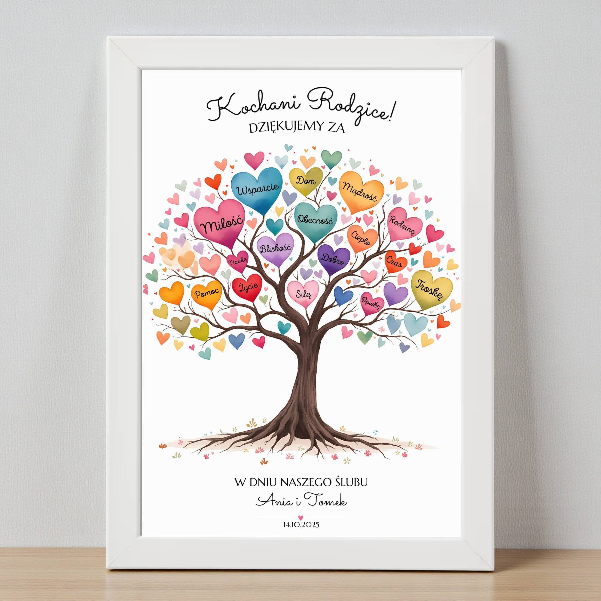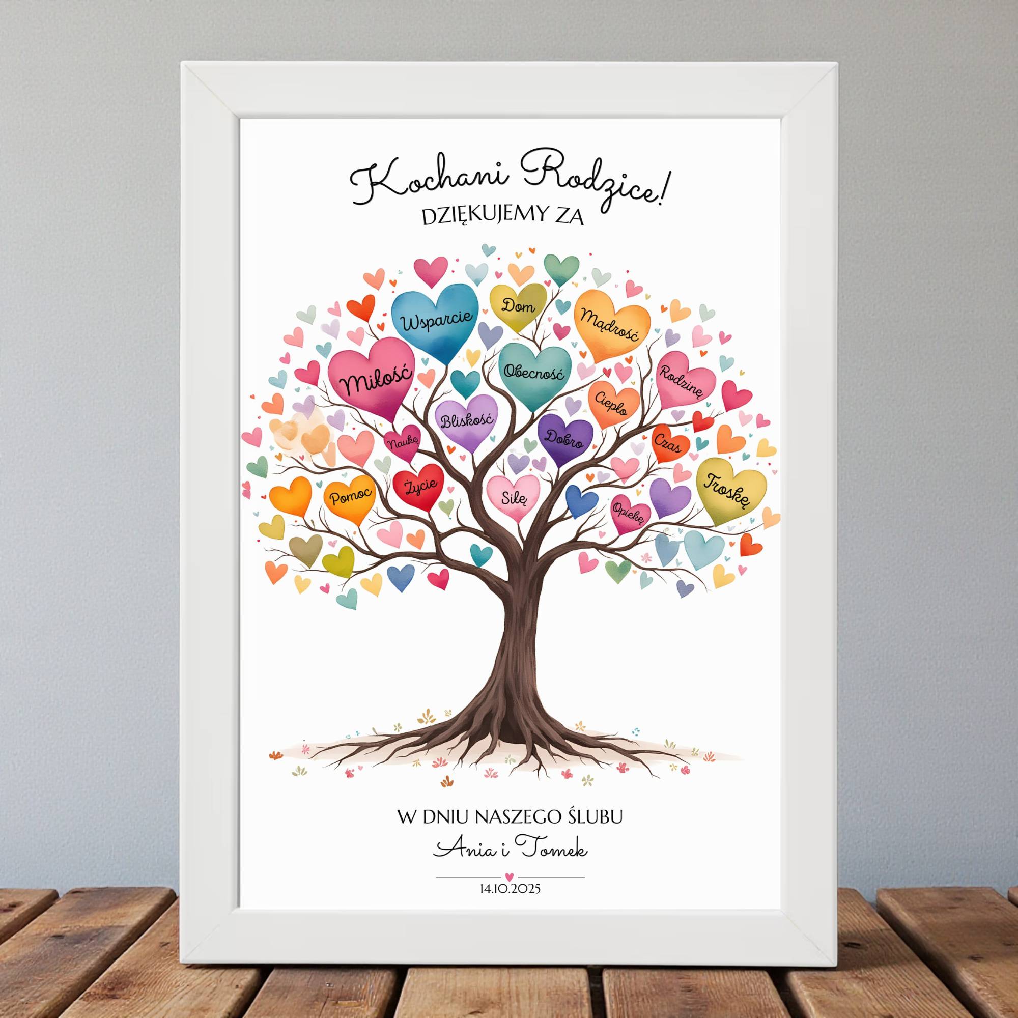 Szukasz wyjątkowego prezentu, który wzruszy i zostanie z najbliższymi na lata? Obrazek z drzewem pełnym serc to idealny wybór dla Rodziców, Dziadków, Chrzestnych czy Bliskich. W sercach zapisaliśmy słowa pełne emocji – miłość, wsparcie, troska, ciepło – wszystko to, za co chcecie podziękować w dniu ślubu. Personalizacja obejmuje nagłówek oraz podpis pod drzewem (zarówno tekst, jak i imiona), dzięki czemu Wasza pamiątka będzie w pełni wyjątkowa i jedyna w swoim rodzaju.