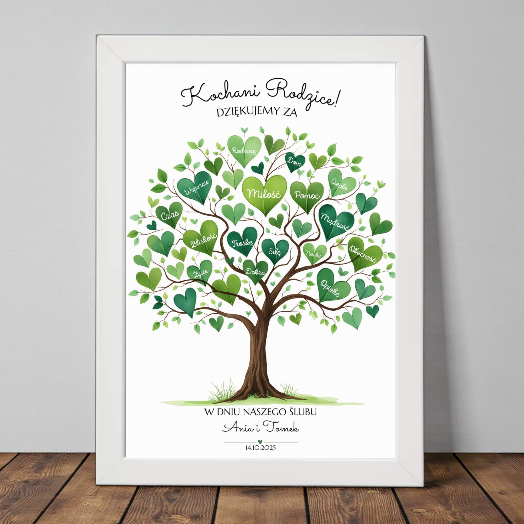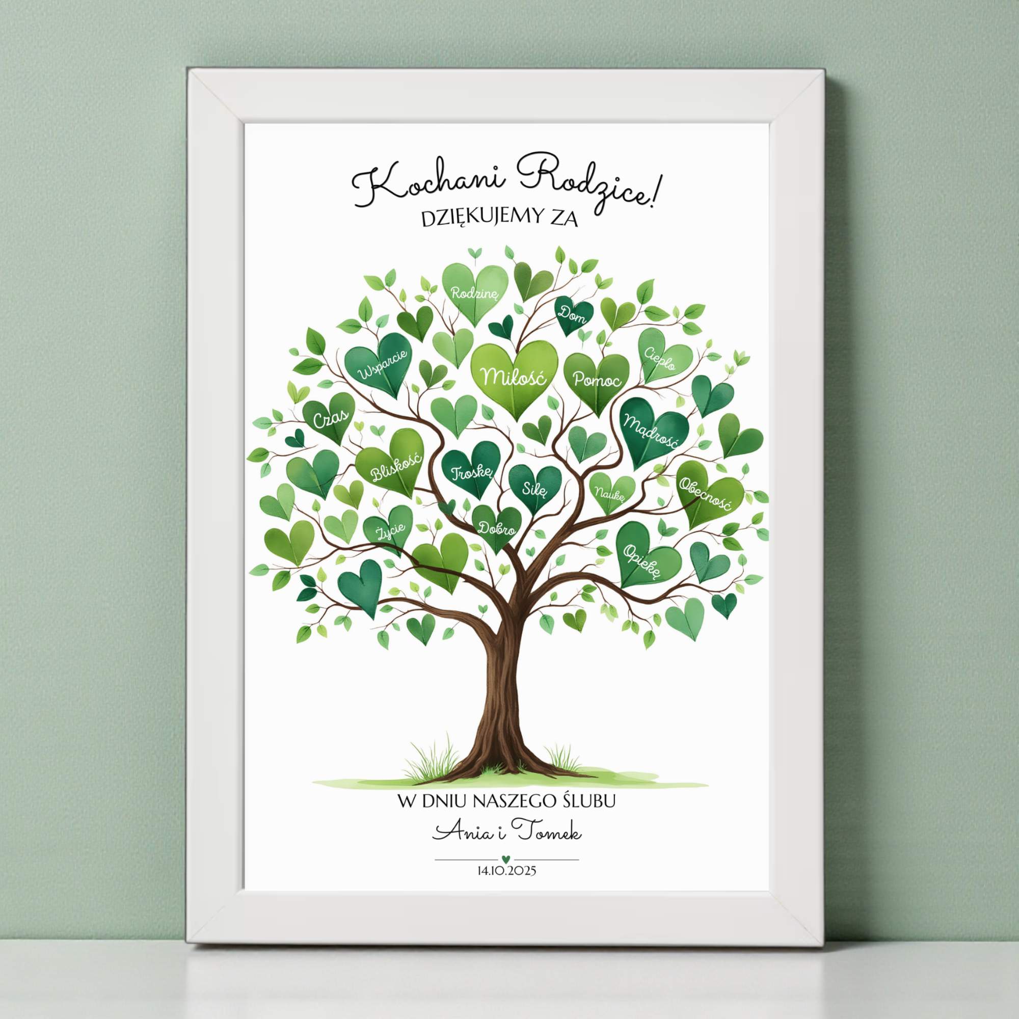 Szukasz wyjątkowego prezentu, który wzruszy i zostanie z najbliższymi na lata? Obrazek z drzewem pełnym serc to idealny wybór dla Rodziców, Dziadków, Chrzestnych czy Bliskich. W sercach zapisaliśmy słowa pełne emocji – miłość, wsparcie, troska, ciepło – wszystko to, za co chcecie podziękować w dniu ślubu. Personalizacja obejmuje nagłówek oraz podpis pod drzewem (zarówno tekst, jak i imiona), dzięki czemu Wasza pamiątka będzie w pełni wyjątkowa i jedyna w swoim rodzaju.