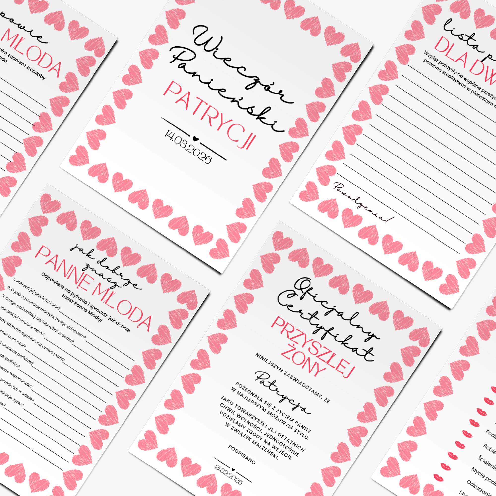 ✅ Pełna personalizacja: W zestawie otrzymujesz dedykowaną stronę tytułową (z miejscem na imię Panny Młodej) oraz Oficjalny Certyfikat Przyszłej Żony oraz datę imprezy, tworząc unikalną pamiątkę.