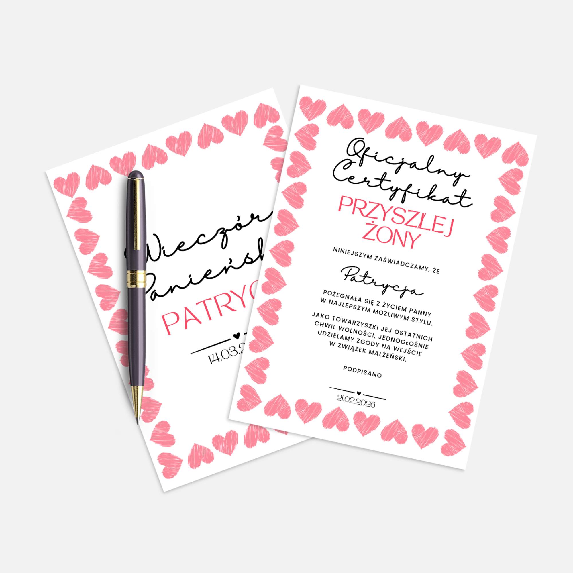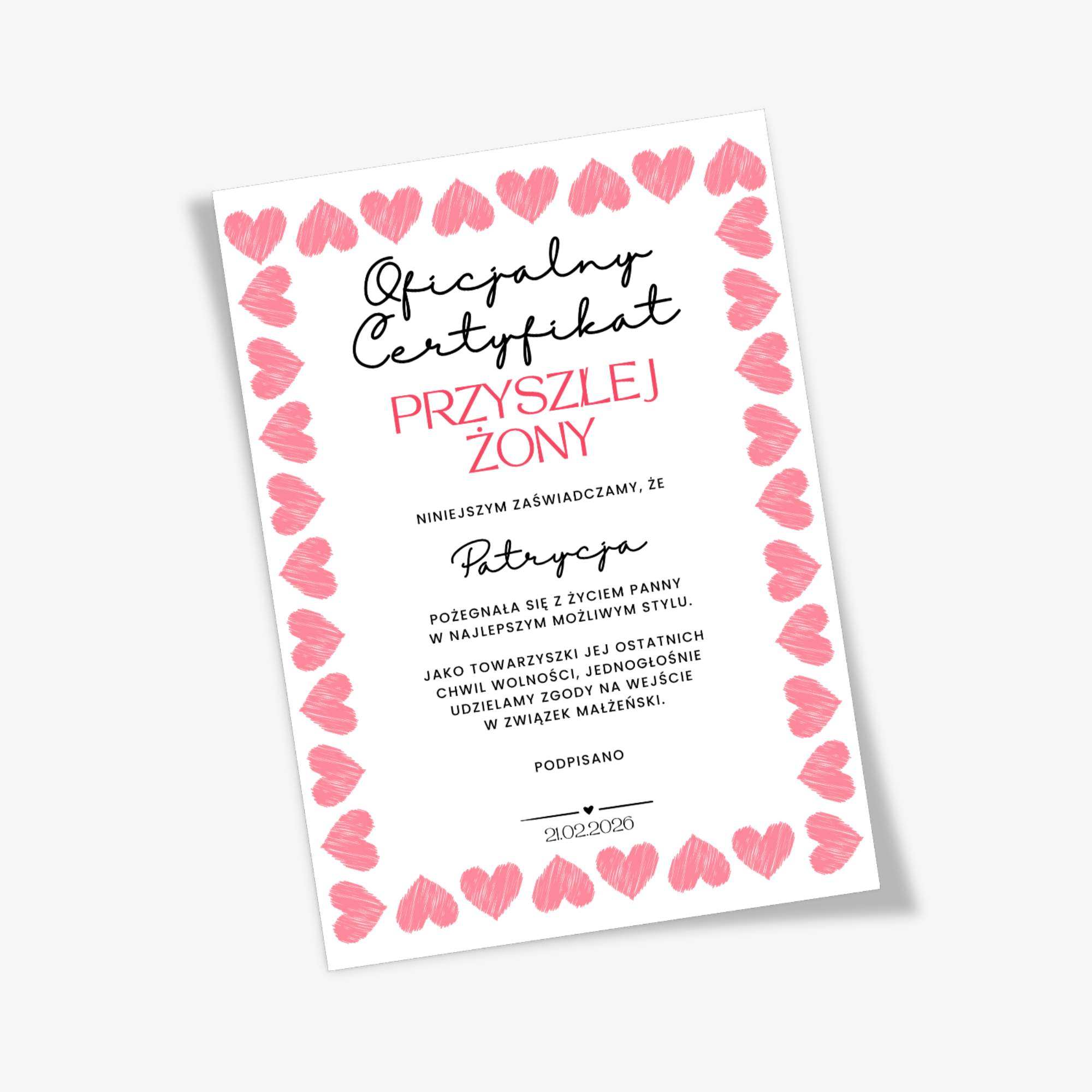 Oficjalny Certyfikat Przyszłej Żony – pamiątkowy, personalizowany dokument z imieniem, datą oraz z miejscem na podpisy wszystkich uczestniczek.